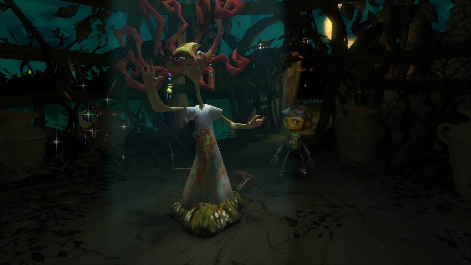 Once you’ve solved all the puzzles, you finally make your way to the girl scouts base and find that they’re hiding the milkman in their underground basement. Raz fights and defeats the troop leader and awakens the milkman, who makes the streets run white with his rage. Because his milk is so delicious (and explody) Raz is kicked out of the astral plane. A slightly less crazed Boyd opens the gate and remembers why he’s here: to make his final special delivery of a milk moletove to the main building of the asylum. It doesn’t look like he’s going to actually throw the thing anytime soon though, so you can finally move further into the complex. Well, you could if there wasn’t an actress performing for some potted plants in the garden, stopping Raz if he tries to walk past because she thinks he’s here to steal her trophy. You know how this song and dance goes by now: Raz enters her mind to help her with her issues and hopefully proceed.