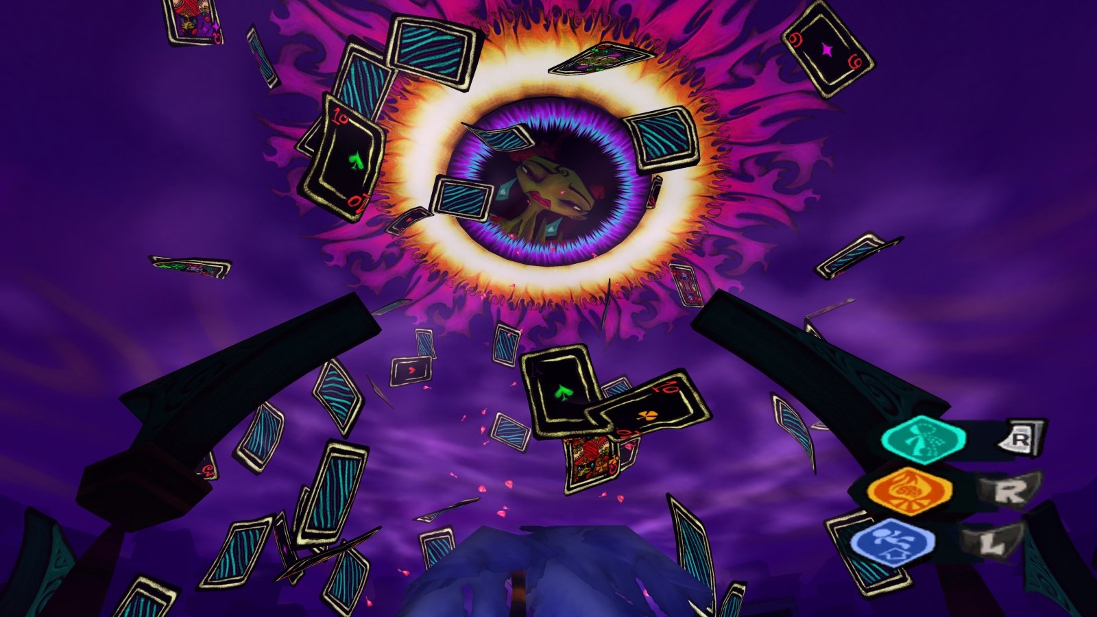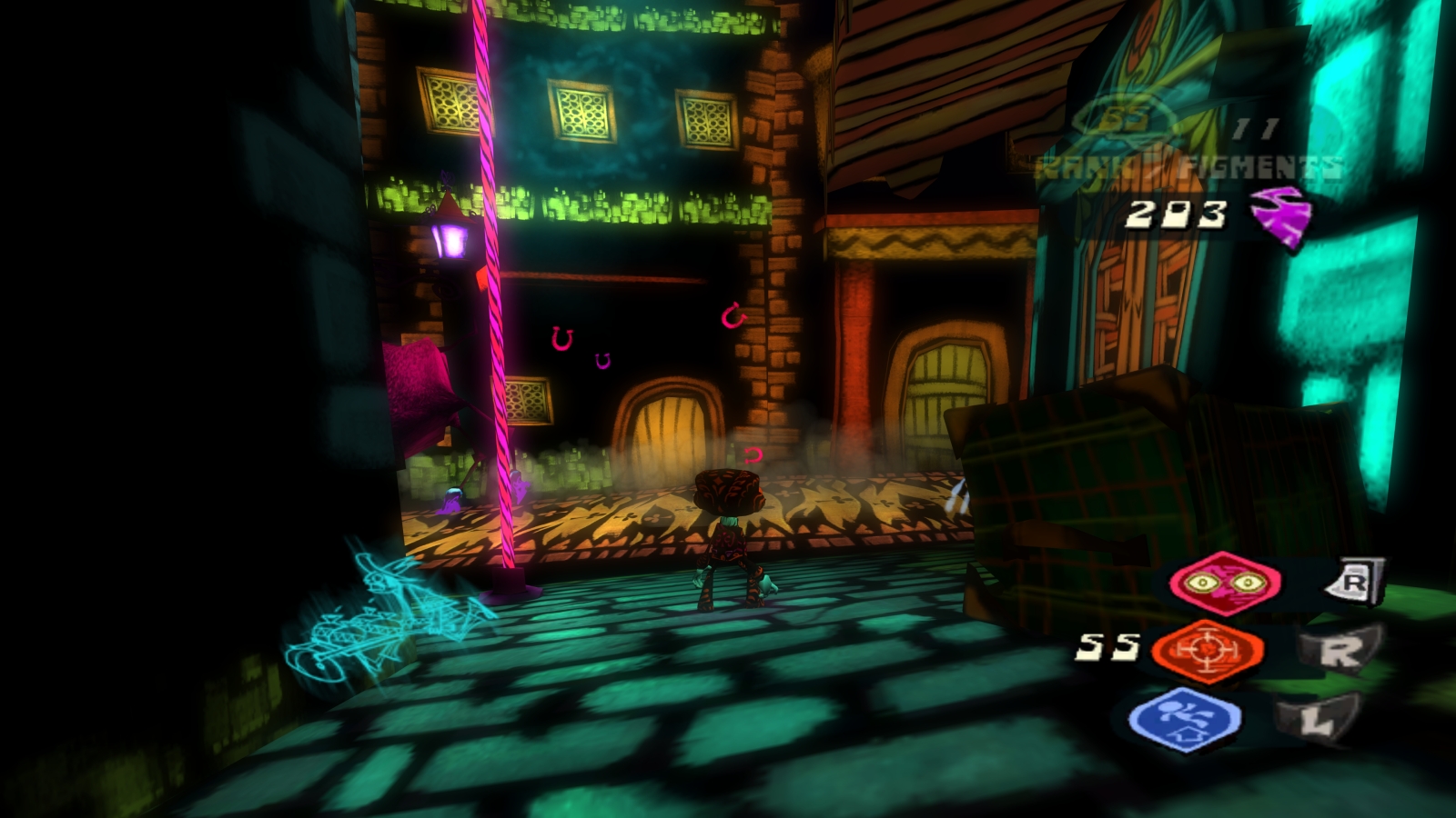 Edgar is free to leave the asylum once he finishes a single painting, but his lingering anger issues make him destroy every canvas after painting a bull and bullfighter over whatever he was painting. He seems like a pretty cool dude otherwise, so Raz enters his mind to help. Black Velvetopia is the most visually striking level of the game with a black and neon aesthetic that even changes Raz’s appearance to match. Edgar is trying to build a tower of cards to reach his love trapped in the sun, but a bull named El Odio keeps knocking it down and stealing the cards. Raz needs to find the four Queen cards in paintings throughout the city while avoiding El Odio charging around street level. This level is another fantastic mix of platforming, puzzle solving, and platforming, where you need to figure out how to reach a certain area by placing paintings that turn into real counterparts to reach new platforms. For example, you can place a guitar painting to serve as a giant ladder or a painting of an archway to make a hole in a wall. Once you reach one of the cards, you need to battle a luchadore with a specific weakness to earn it. To defeat the final one, you need to find the Confusion merit badge, which allows Raz to use the dot in a question mark above his head as a grenade to confuse enemies. It’s a cool power that sadly comes too late in the game to see much use.