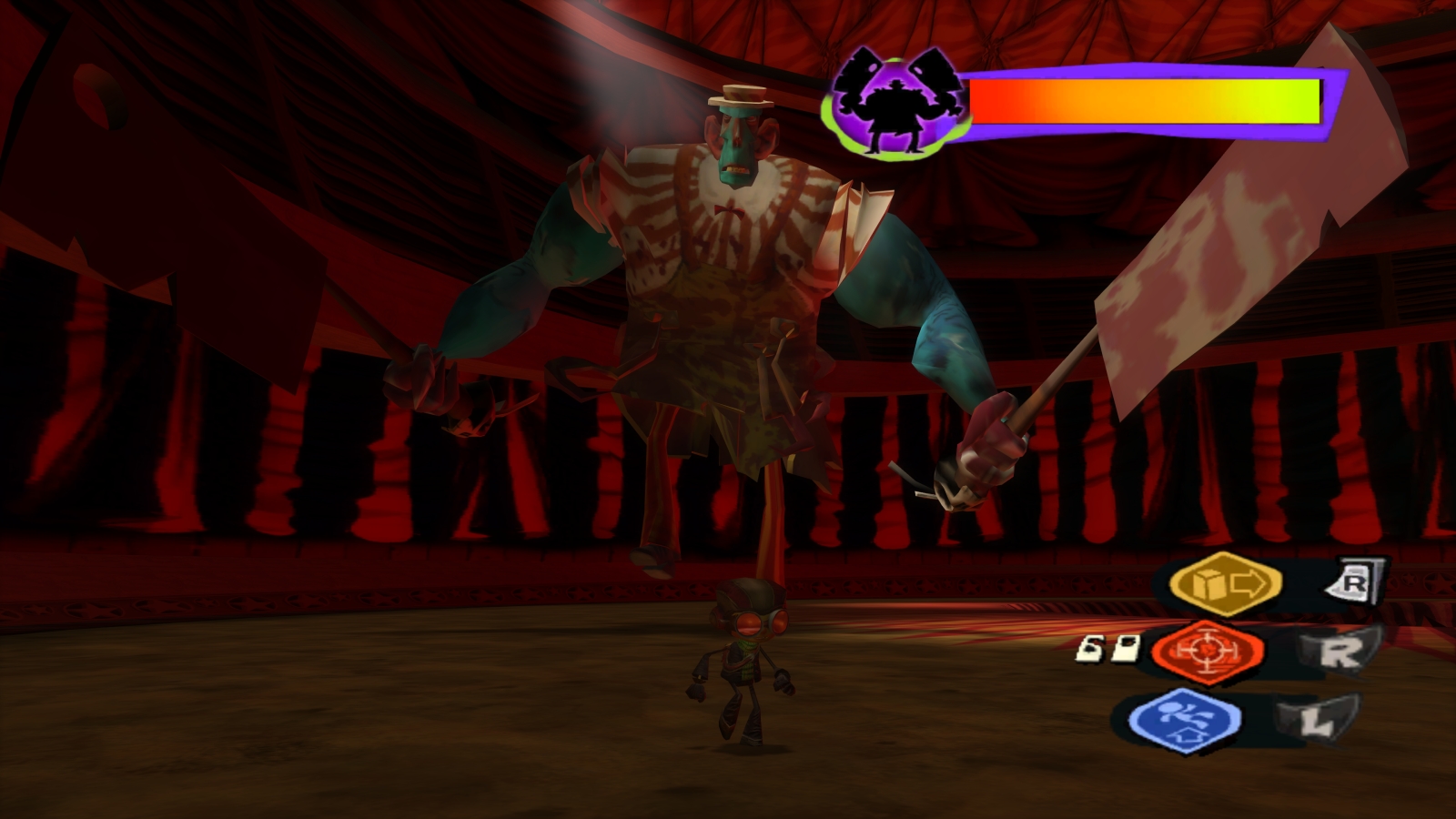 Raz eventually breaks the glass and disables the tank, but Oleander has one more trick up his sleeve: sneezing gas. The same gas that caused everyone to sneeze out their brains, Raz fails to hold it back and his body goes off to mindlessly (pun intended) watch TV. He has no choice but to enter the tank with the Coach’s brain, and the two mental worlds begin to mix. This comes with good news and bad news. The good news is that Raz can help Oleander overcome the childhood trauma that made him evil while confronting his own mental demons in the process. The bad news is that anything that happens to Oleander now also happens to Raz, so he has to protect a childhood version of the Coach while navigating the game’s most infamous and difficult level, the Meat Circus.