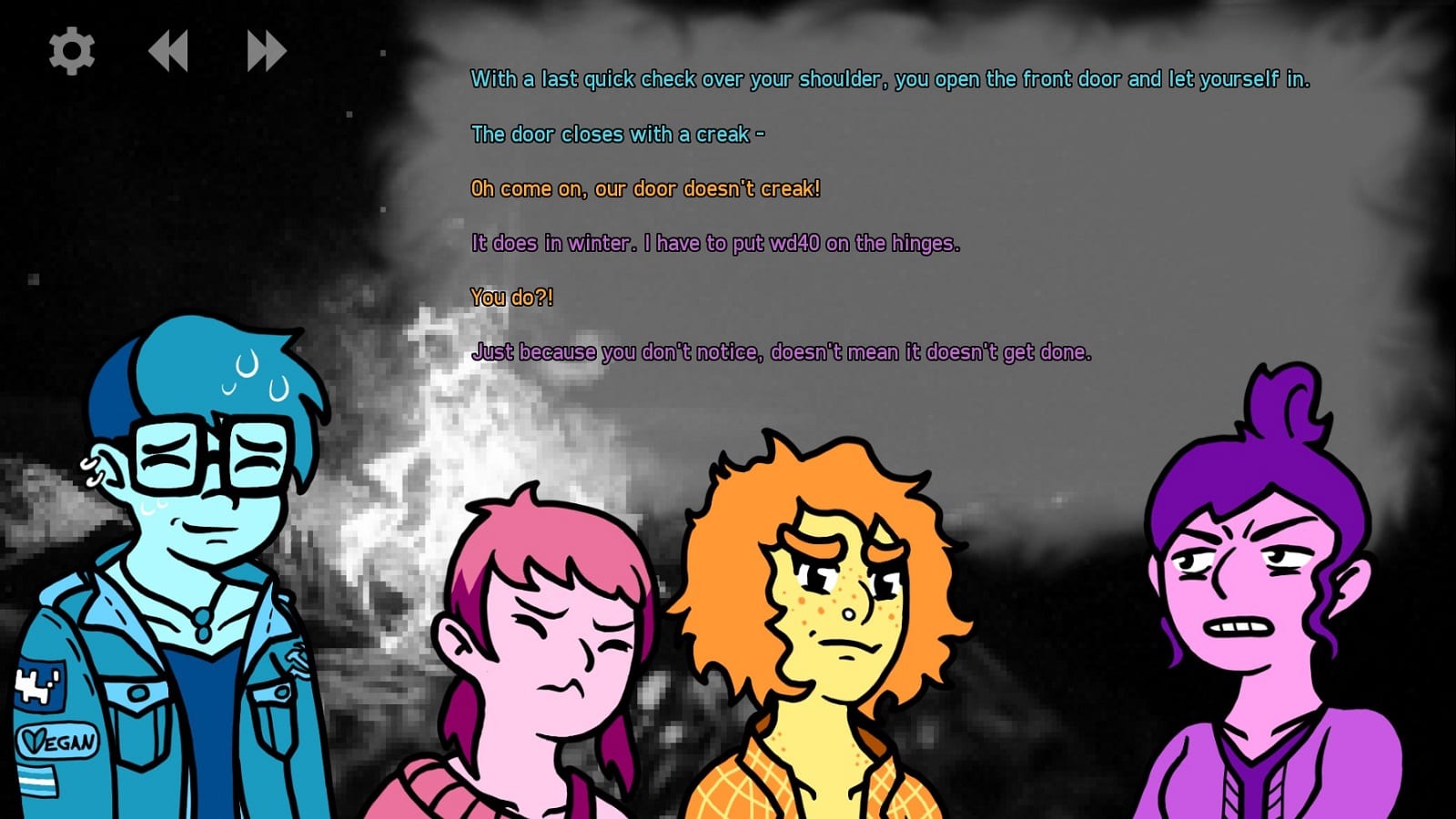 It’s October, which means spooky season! You know what that means: An indie visual novel where you start to tell a scary story to your friends, but they keep interrupting you in order to interject their own narratives. Do you go with a sweet romance, a stoner comedy, or an actually scary tale? Unlike Cover Me in Leaves, this one does have some choices and even multiple endings you can encounter, which makes it a little stronger than the former. I also like the cheeky banter between the characters; it’s just a shame it ends before it gets good.