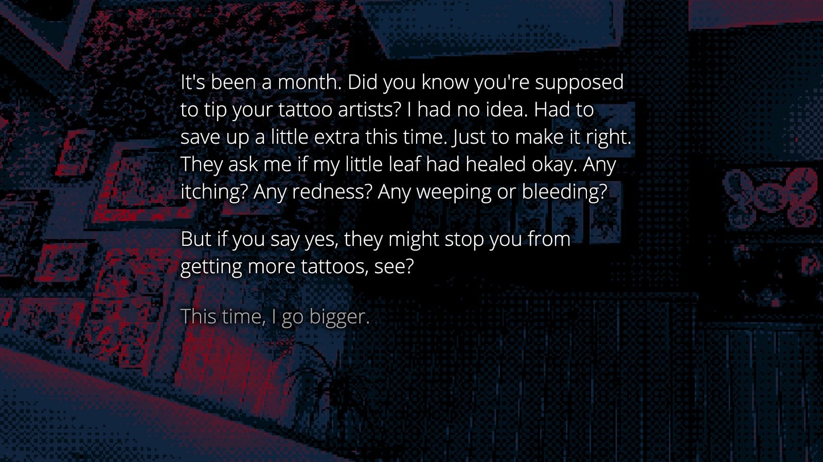 This is a kinetic novel (which means no choices are made) about a girl living in a small town. While there’s much to infer here, the story goes in some mature territory as well as symbolism with the main character’s tattoos. It’s a heartfelt narrative that’s over in less than 10 minutes but also has an ending that clashes with most of the story; that said, I did dig the minimalist glitch backgrounds and setting.