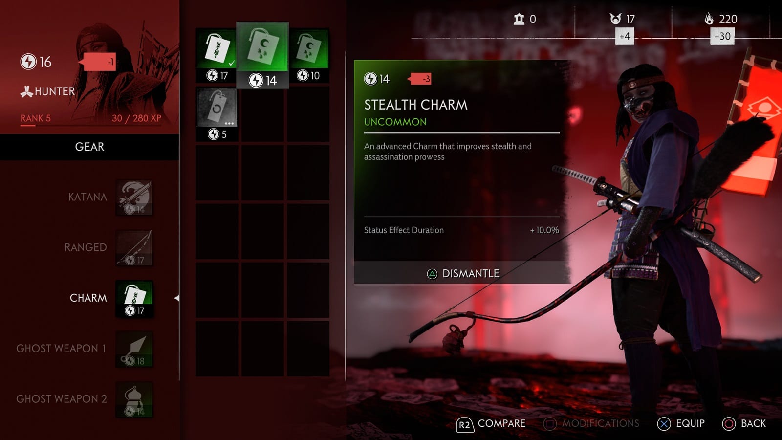 Legends plays much like the base game, but with other players and without the gorgeous open world. Jin’s wide range of abilities are split between four classes: Samurai, Hunter, Ronin, and Assassin. While they play the same for the most part, each excels in a certain aspect of combat. For example, the Hunter has powerful ranged attacks with a bow while the Ronin has the ability to heal their fellow ghosts. After a tutorial explaining each class, you’ll have to pick one to play until you can unlock others by ranking up. I chose the Hunter to take out foes stealthily from range. As you play, you’ll receive random loot drops to customize your character’s gear. Instead of being able to switch sword stances to combat different enemies, katanas in this mode come with a single style. This didn’t make combat any more difficult than the main game, since enemies here are overall easier to take down, but it does feel like a layer of strategy has been removed here.