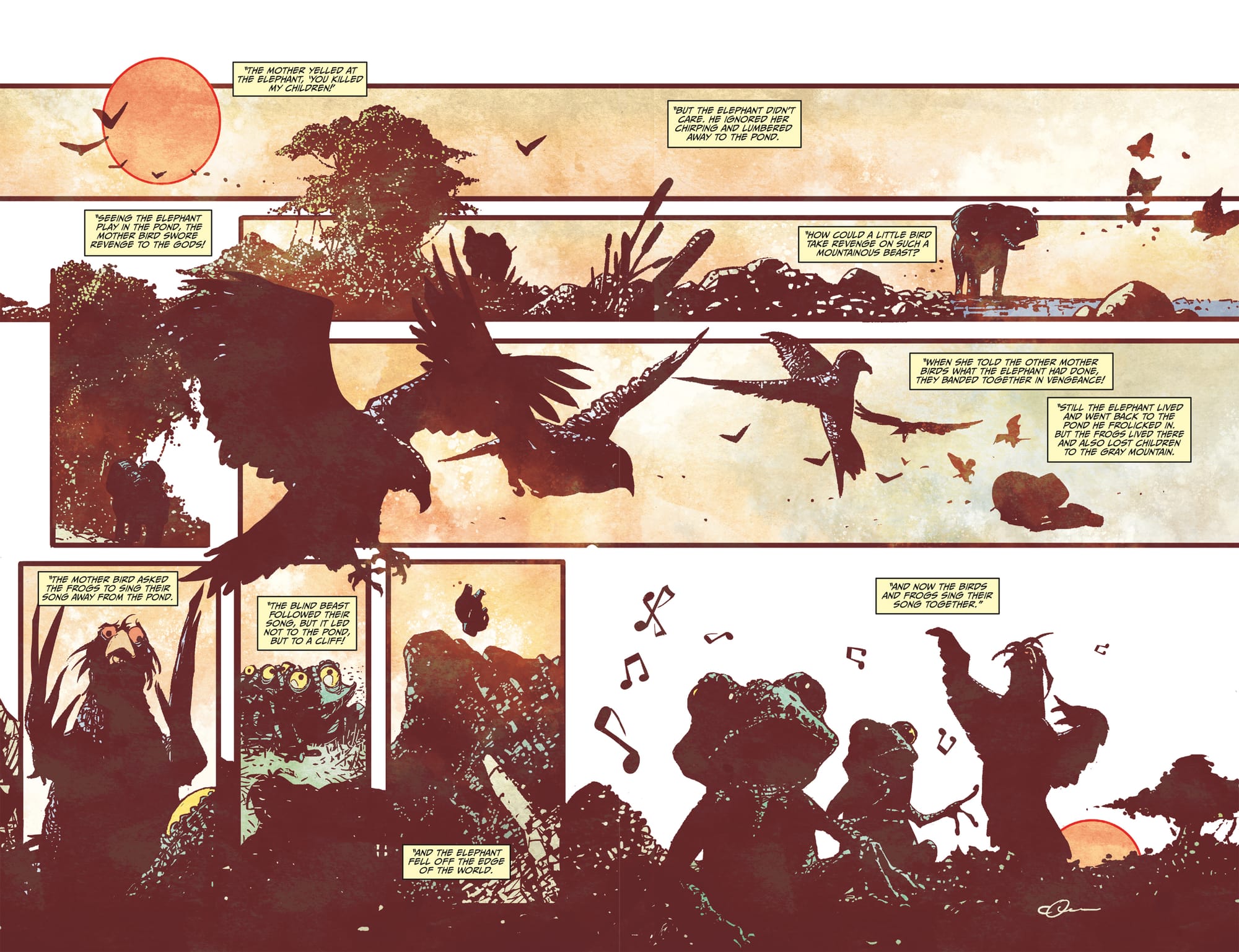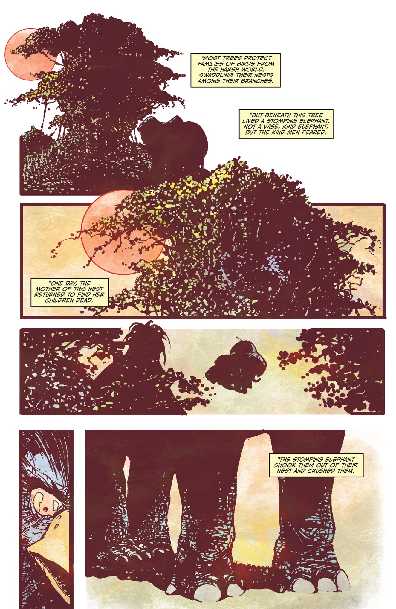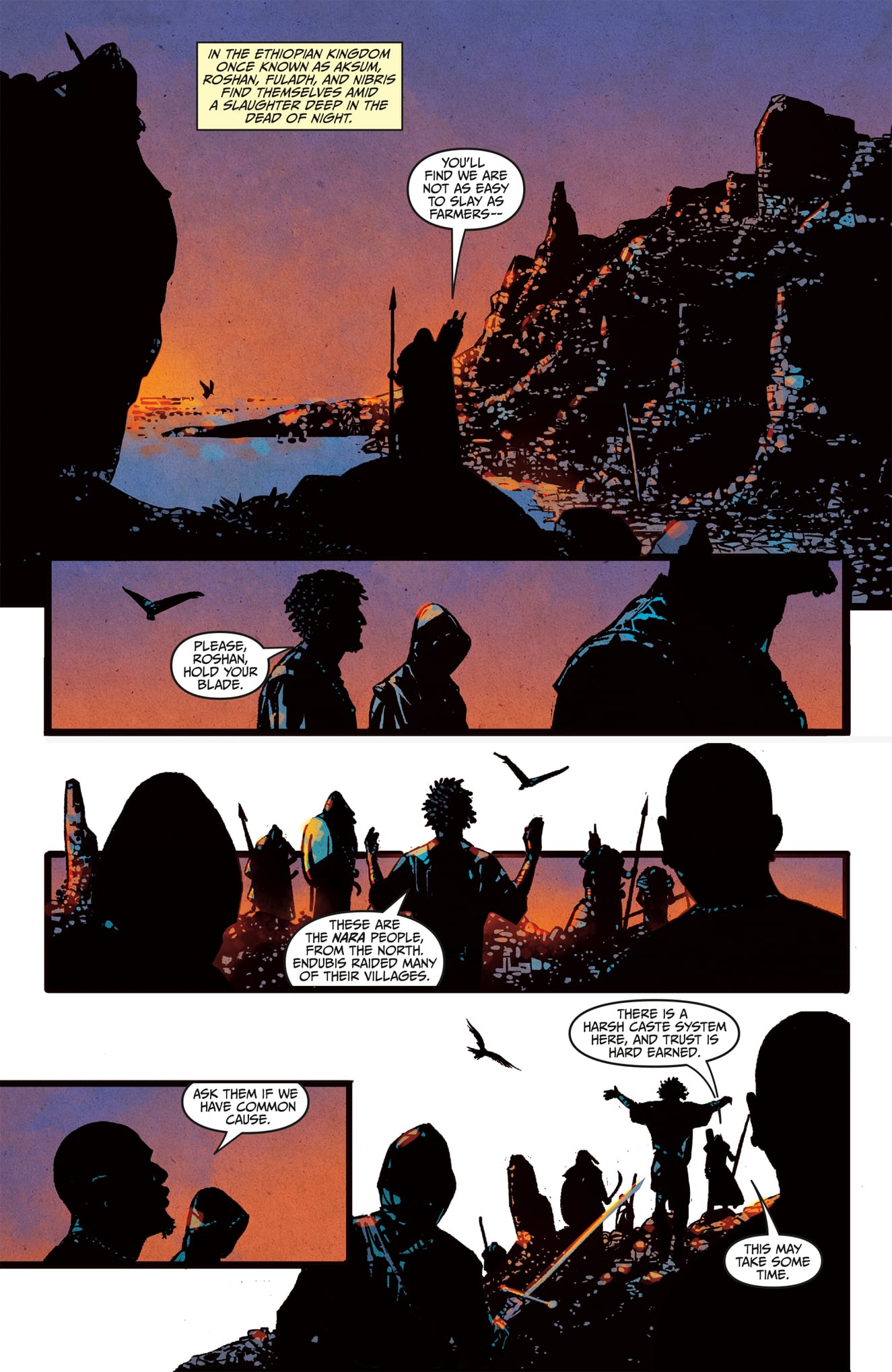 This comic can be a bit dark at times, while this art style allows for some really cool visual moments such as the intensity of the detail work on some of the characters or animals, it can make figuring out characters a bit hard past "this character is an Assassin because of their white hood.