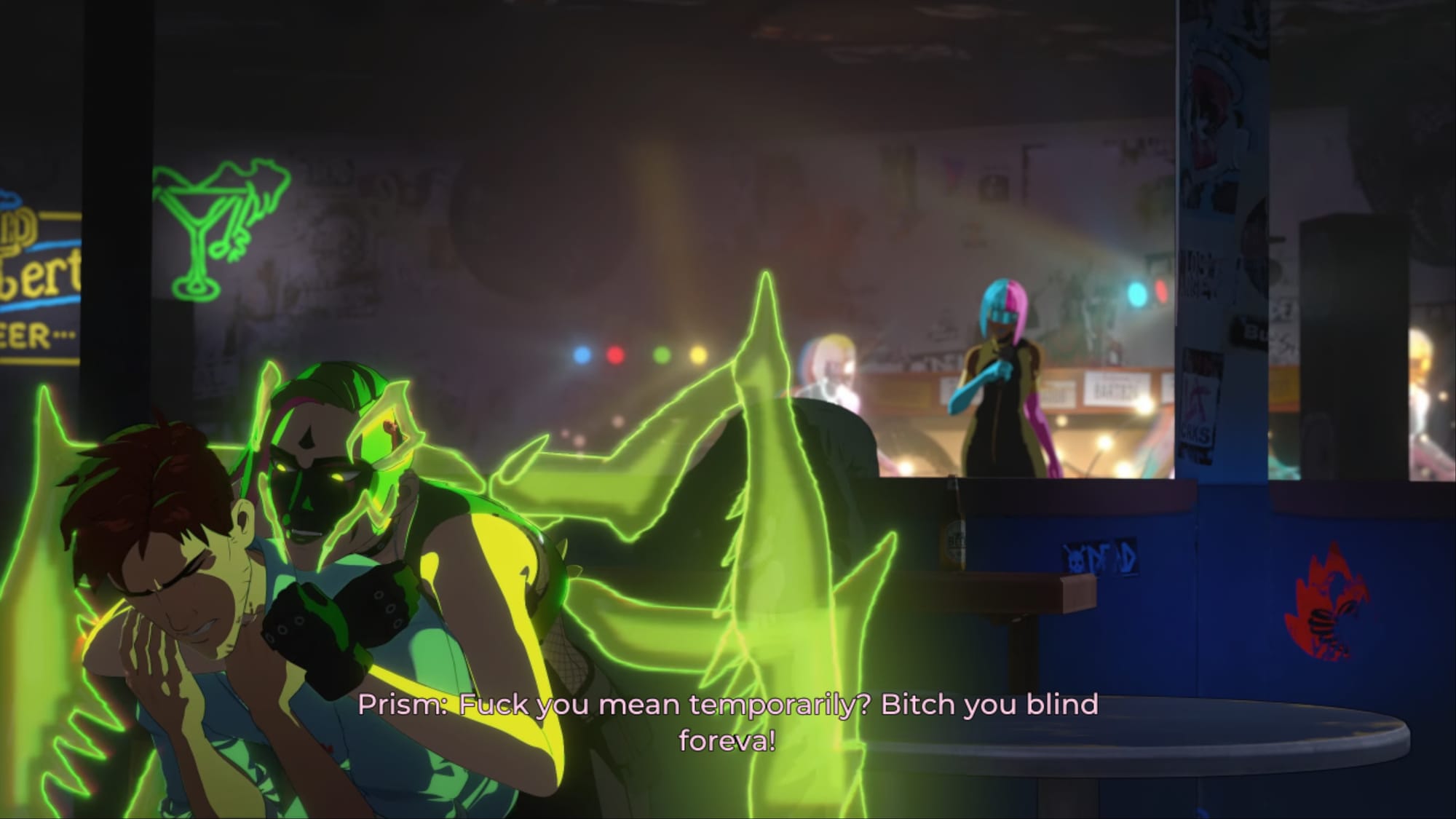 Which leads into this episode’s key scene and probably the best in the game so far. After work, the Z-Team invites Robert to get drinks with them at a villain bar. The night starts off cold and a bit standoff-ish, with the team each separating into small cliques, none of which have room for Robert, but when a bar fight starts they all come together to kick some ass and get tacos afterwards. It’s absurdly violent in a way that’ll either be hilarious or gross you out, and uses flashy edits to intercut between completing quick time events at the taco place or in the bar fight will cut back to the other scene. They really went all out here with some fun needle drops too.