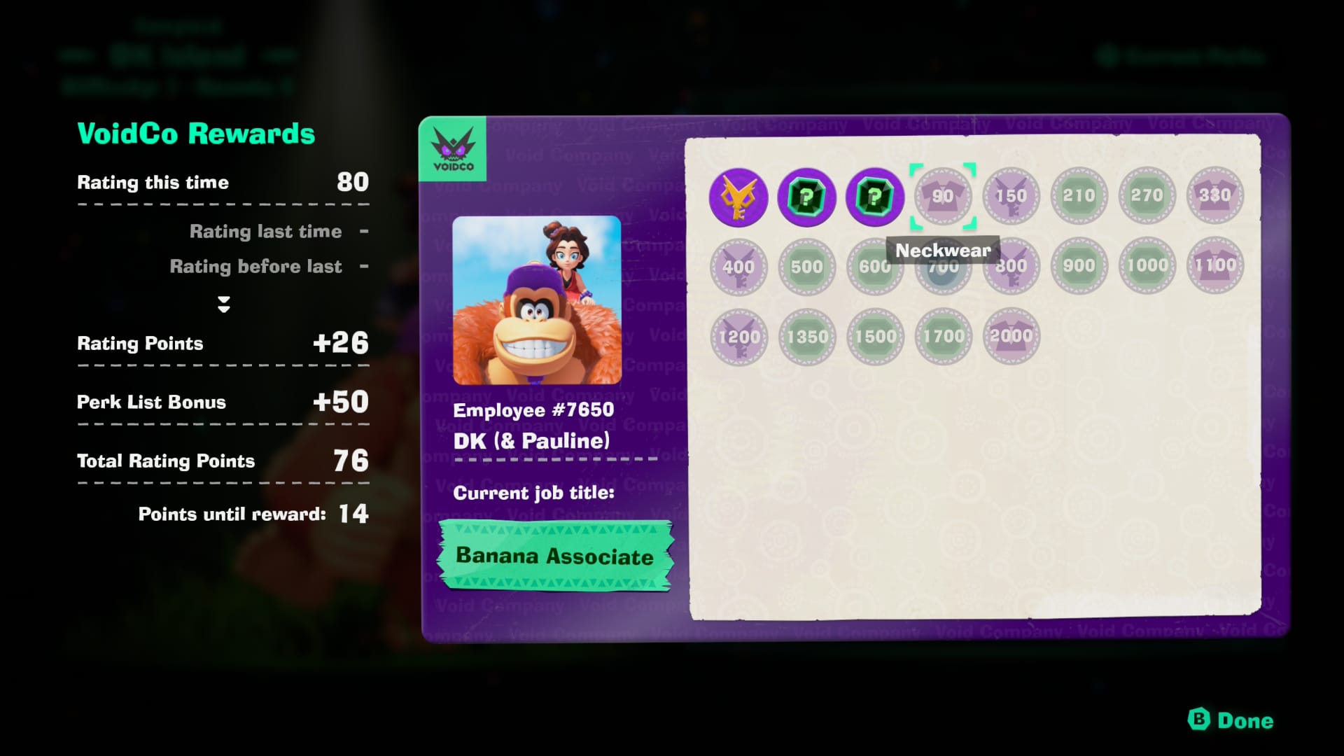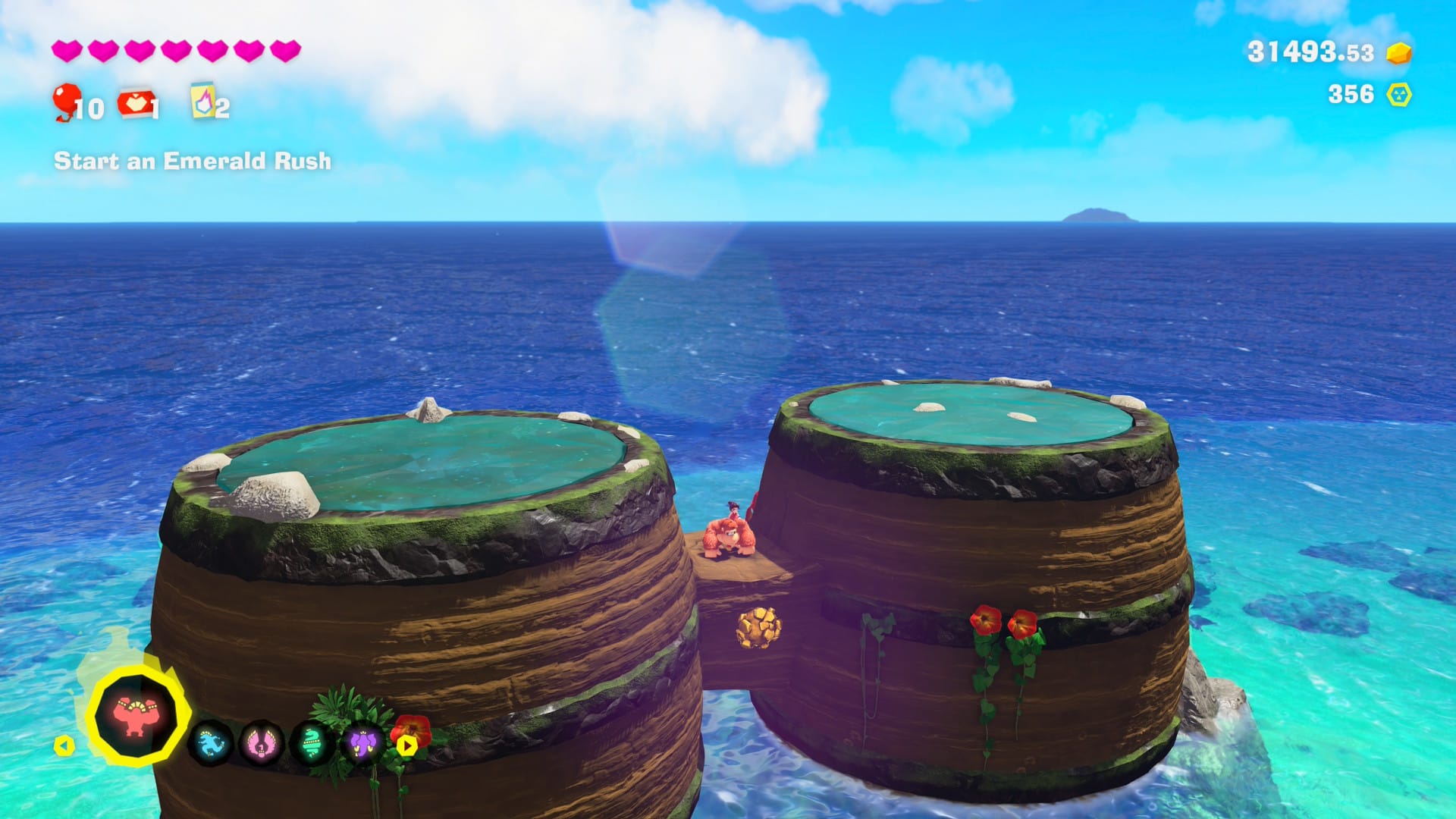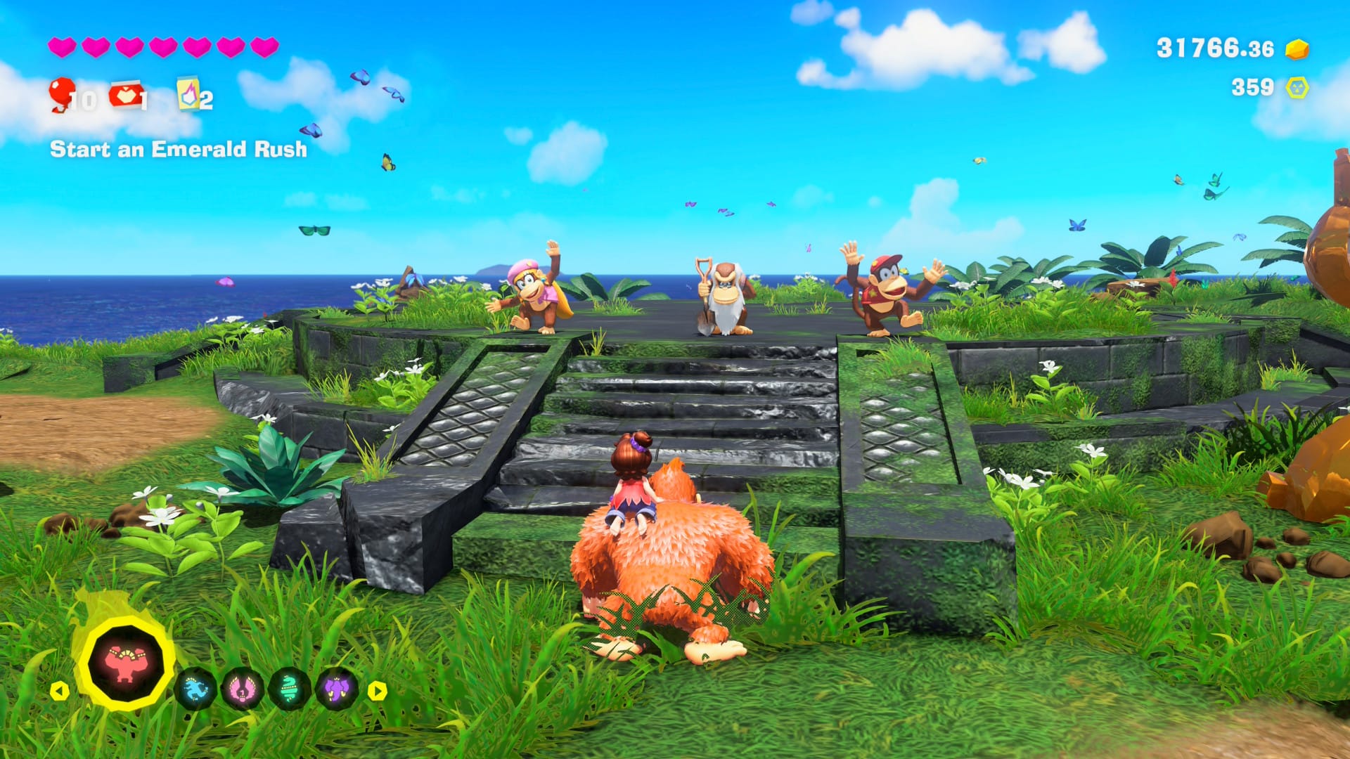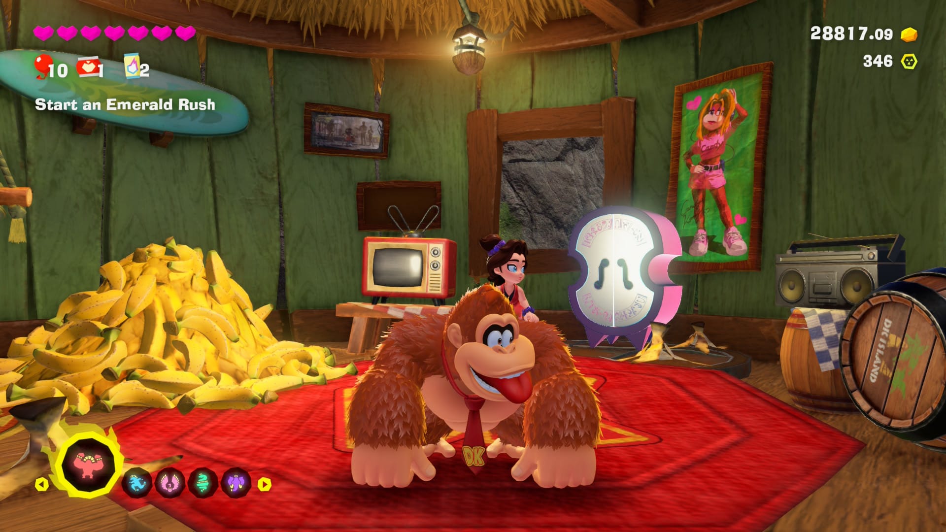Emerald Rush isn’t something that got me excited after finding out the premise. Essentially, after the events of the main game, Spoilers Ahead, Void Co. is back but without any of their minions. So the CEO/President of Void Co., Void Kong, recruits DK and Pauline to collect Emeralds, which is reskinned gold on the map, so he can continue making money. Sadly, you don’t have much choice and you work with him and destroy DK Island (for the time being) collecting emeralds for him. You get some cute items for beating these collectathon timed events, but they’re not difficult to beat at all.