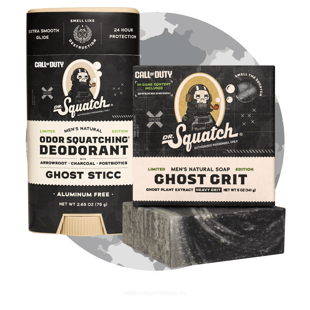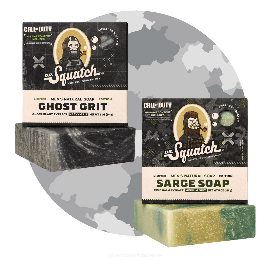 - Ghost Grit ($6 individual bar; subscribers only): Gear up for battle with Ghost Grit – a heavy-grit bricc inspired by the Call of Duty legend himself, Lieutenant Simon "Ghost" Riley. Rugged, earthy scents of pepper and leather team with smokey charcoal to immerse you in the heat of the action. Customers can redeem a code found inside the soap box to unlock a customized Dr. Squatch calling card – exclusive to this collab only!
