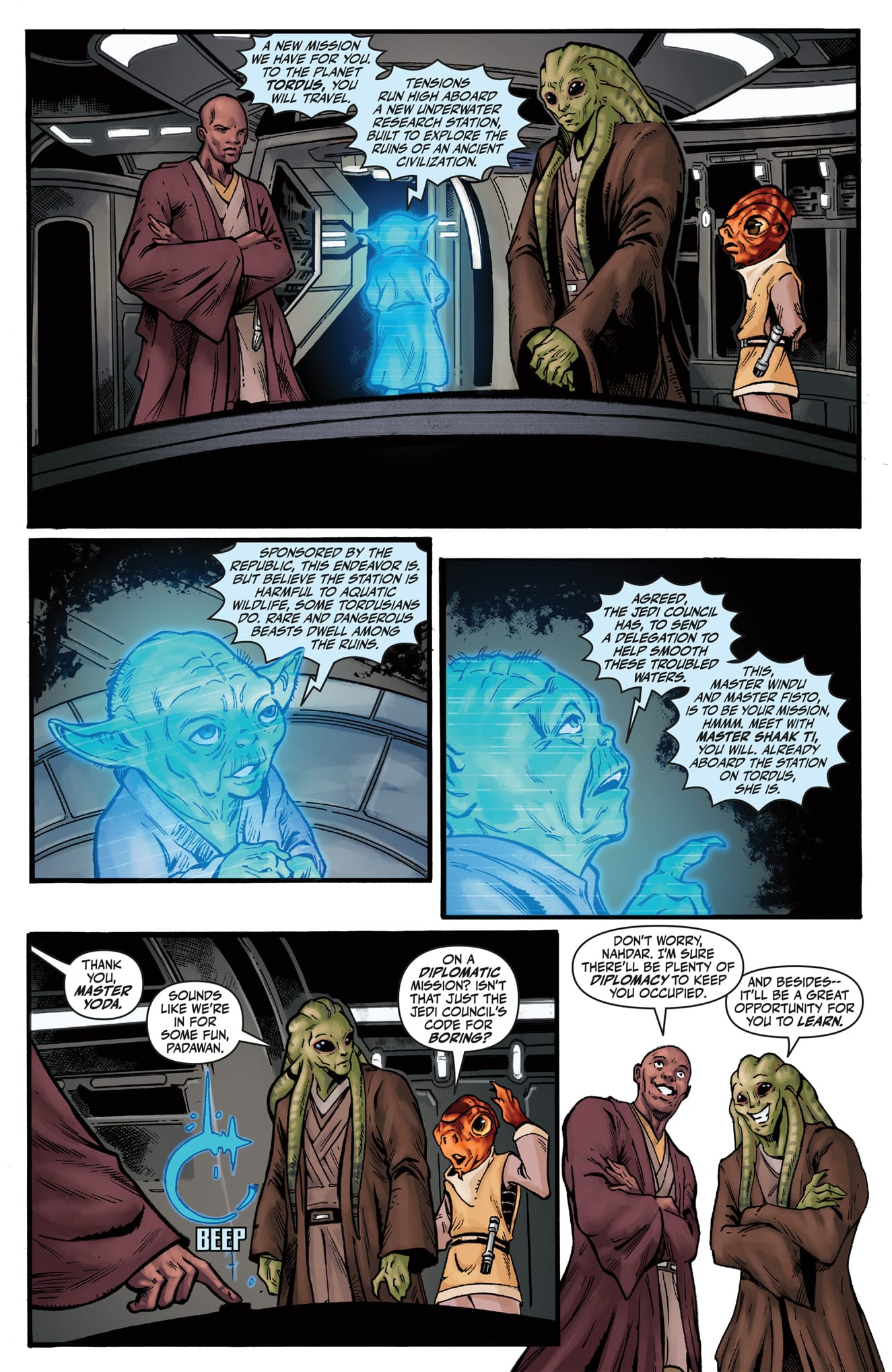 Kit Fisto and Nahdar Vebb return for a new story teaming us with Jedi Master Mace Windu to travel to a water planet to assist with a political matter.