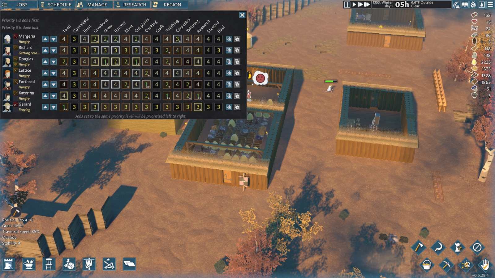 You’ll also want to adjust all of your colonists’ job rankings right at the start of the game, and also do this for each new colonist that joins your settlement. Set the priorities higher for your sims who have higher proficiency in the particular job. You can find this under the Jobs tab.