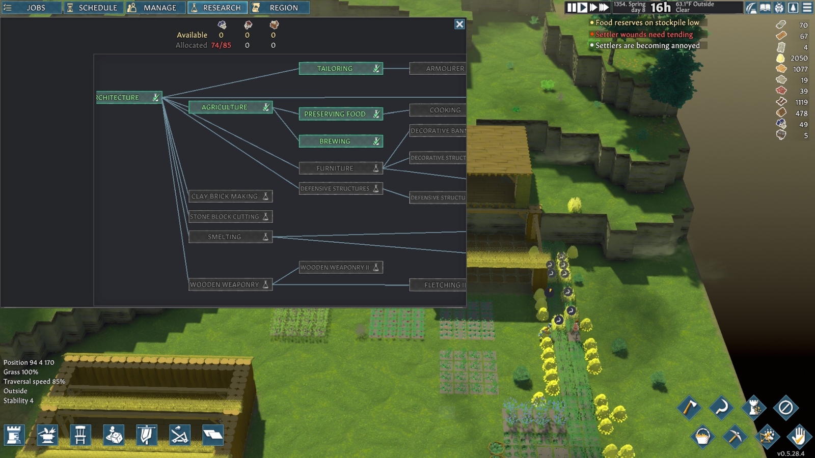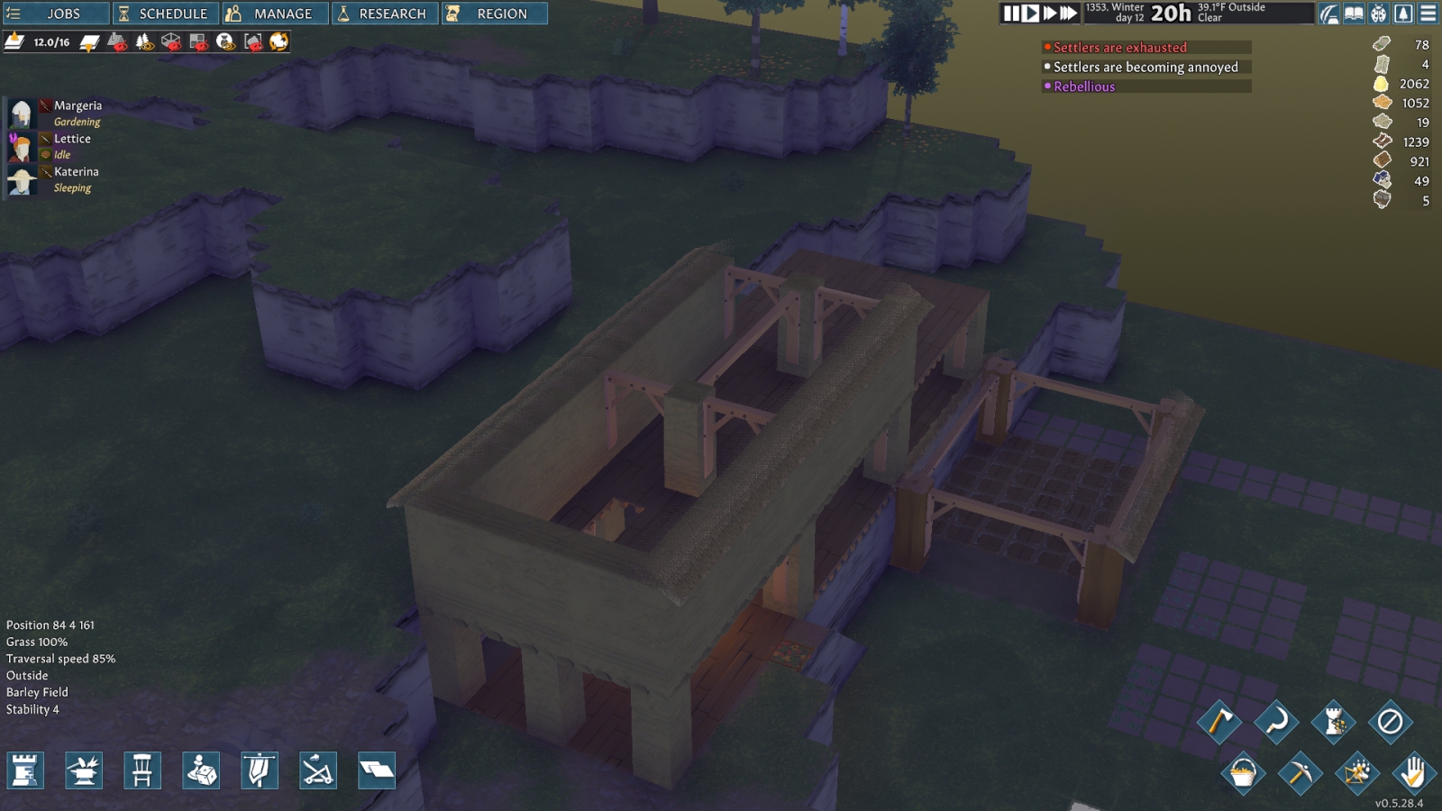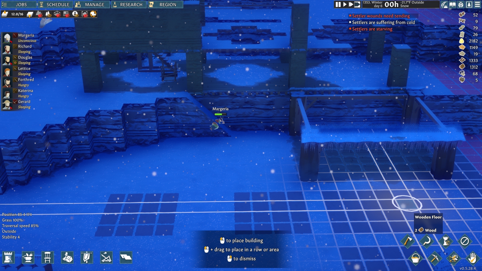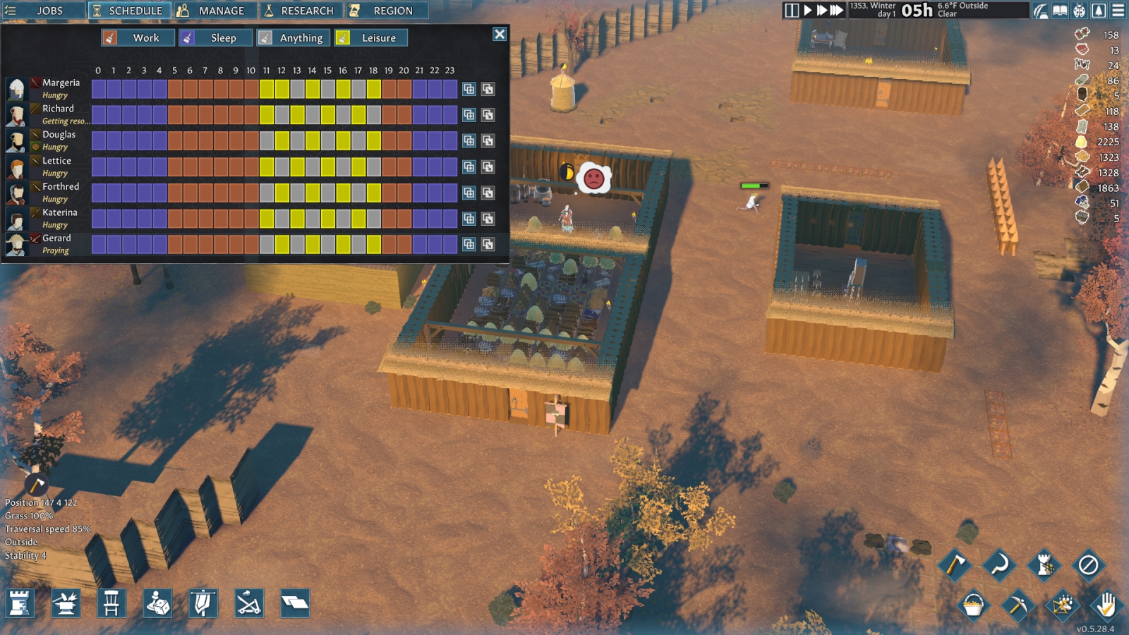 Seasons in this game can, and will, kick your ass. I started out in Spring but before long it was summer, and most of the meat I had gathered up rotted because I hadn’t made a basement for storage. Temperature plays a huge part in the game, for both your villagers and your storage. I am now in the middle of my first winter, and just about every single one of my villagers passed out in the snow outside at least once whilst building my new base. I was working on making better winter clothing for them, but before I could finish, a pack of wolves attacked and made quick work of most of my colony. I am down to three colonists who are all badly injured, rebelling, and bleeding out. Oh, and all of this in the middle of a cold snap. So take it from my failed experiment on my first map, prepare for summer and winter as soon as your game starts.