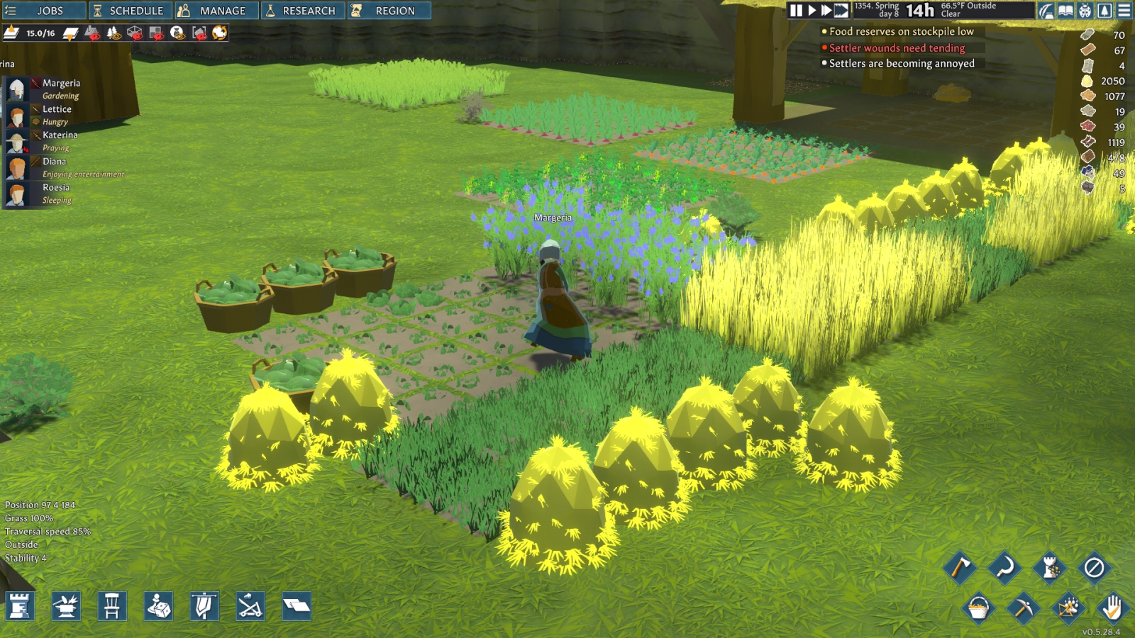My poor little colonists have been through a lot in just one season, and as the remaining three dig graves to bury their friends in, I have to wonder what the next year will bring for them. I have one villager named Margeria who has been the hero of the entire settlement in more ways than one, and thankfully she didn’t die. I was scared when she passed out in the snow and had only a few hit points left, but she picked herself up, limped back to her bed with blood spraying everywhere, got herself patched up and now she is back out in the fields plowing for the spring plant. That Margeria is one tough cookie. I definitely have to organize my storerooms and items better, and make sure that I stockpile more food in the basement so all of her hard work doesn’t go to waste.