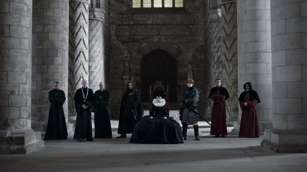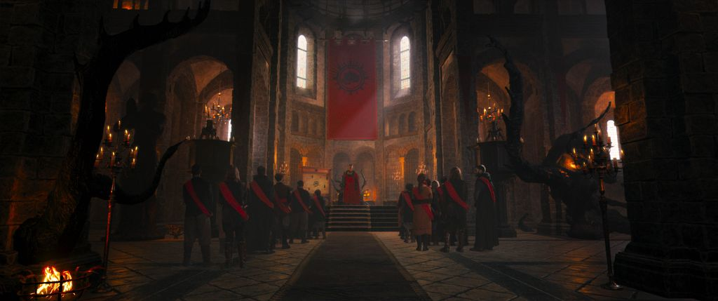 Once again, we find a COVID project spurring intense creativity: how does one shoot something outside, with masked characters, who must stay apart from one another? Suffer is the answer. The natural scenes of journeying around the kingdom were all shot in Idaho at the end of 2020, sometimes amidst two feet of snow. The castle set is VFX, posing its restrictive regime as something inherently indecent and unnatural to the human animal. It's a desolate, dispassionate place which is completely at odds with the broad world outside. This deliberate framing melds perfectly with a later scene of psychic assault, in which the two aesthetics meld together, fighting in a conflict over the character's mind and our focus.