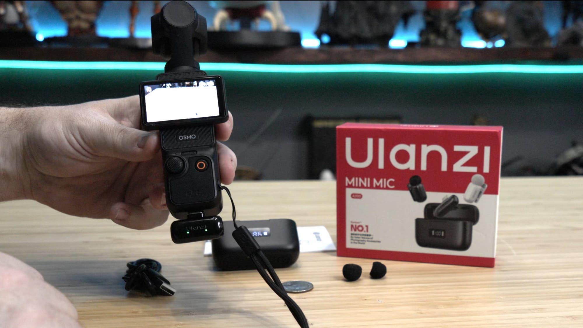 If you're so inclined, you can hook this up to your PC via the included USB-A to USB-C cable, plugging the C end into the side of this receiver. Obviously this also works with Android and iOS, but I also wanted to test it with my DJI Osmo Pocket 3. It springs to life just as quickly as it does on my phone, with the audio tally up top jumping as I talk within seconds. This gives me a solid improvement over the internal microphone, and it's tiny and easy to carry, just like this little camera.
