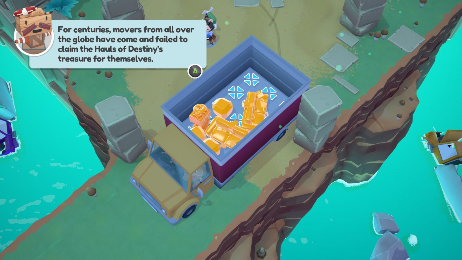 Movers in Paradise can be accessed at any time during the main campaign by simply driving over to a boat on the world map. The F.A.R.T. crew travels to Packmore Island, where they find the ancient ruins of a failed resort on top of the even more ancient ruins of a civilization of movers. The comedy holds strong in this DLC, with the absurdity of moving moss covered couches to your truck for no apparent reason other than you feel compelled to do so. If you liked the jokes in the base game, this is simply more of that.