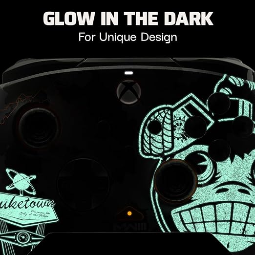 Right out of the box you can tell it fits the aesthetic. This PDP Rematch controller has a nice blend of blacks, grays, and whites, along with orange thumbsticks and back buttons that give it a nice clean design. On the front, you’ve got a sweet Nuketown logo on the left grip, with a huge Monkey Bomb face across the right. What’s really cool is that both glow in the dark, which is a cool choice and works with the Zombies mode aesthetic.