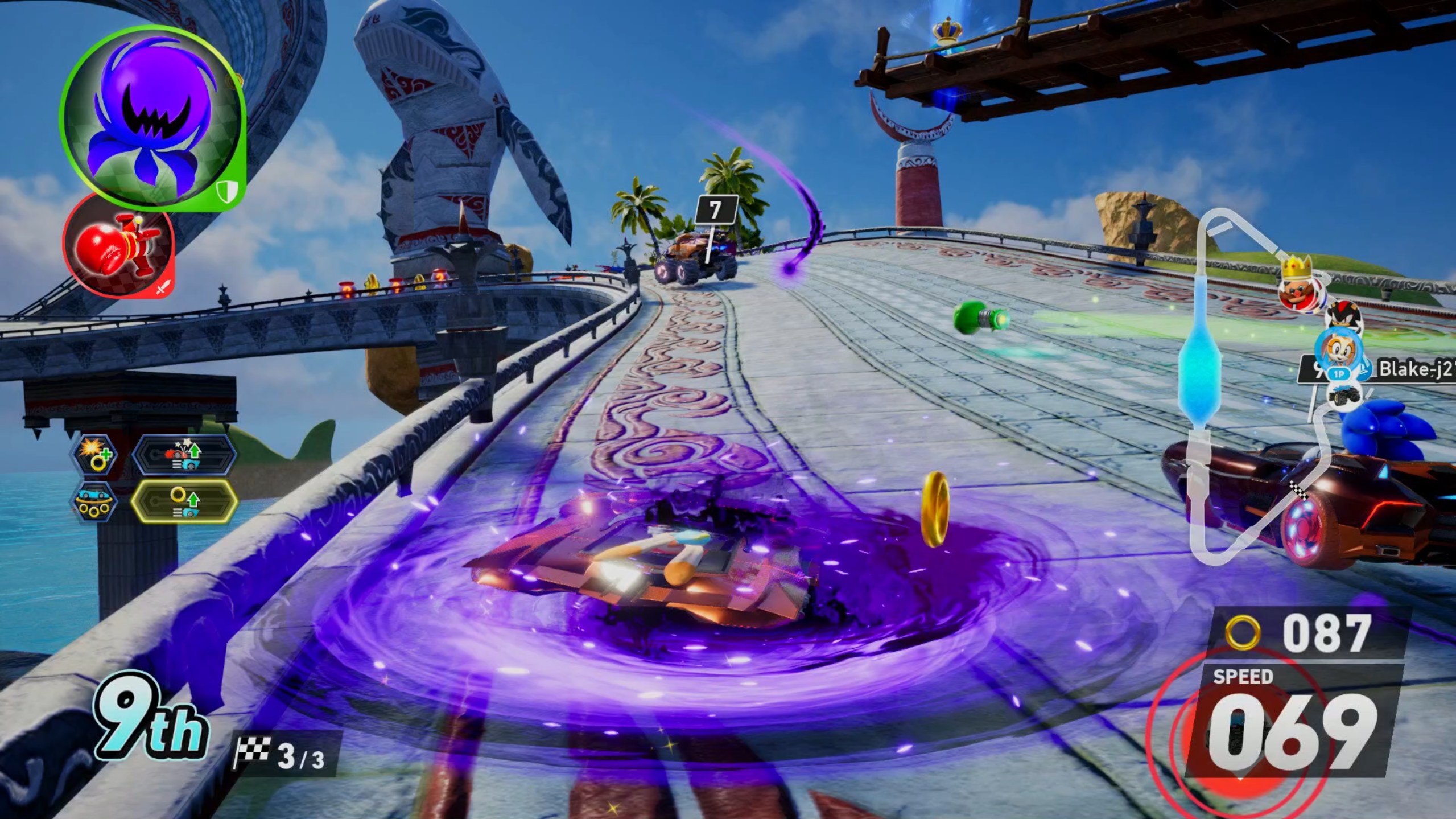 There’s also Gadgets, equippables that offer various bonuses from increased Ring grab range to increasing the speed your drift boost gauge fills. This is a fun idea, but with the limited selection and only six slots available, it didn’t make a massive difference in how I played. Perhaps I need to experiment more, but they felt more like bonuses and less like they were changing how the race went. But then you talk about items and I don’t know what happened here, these need fixing.