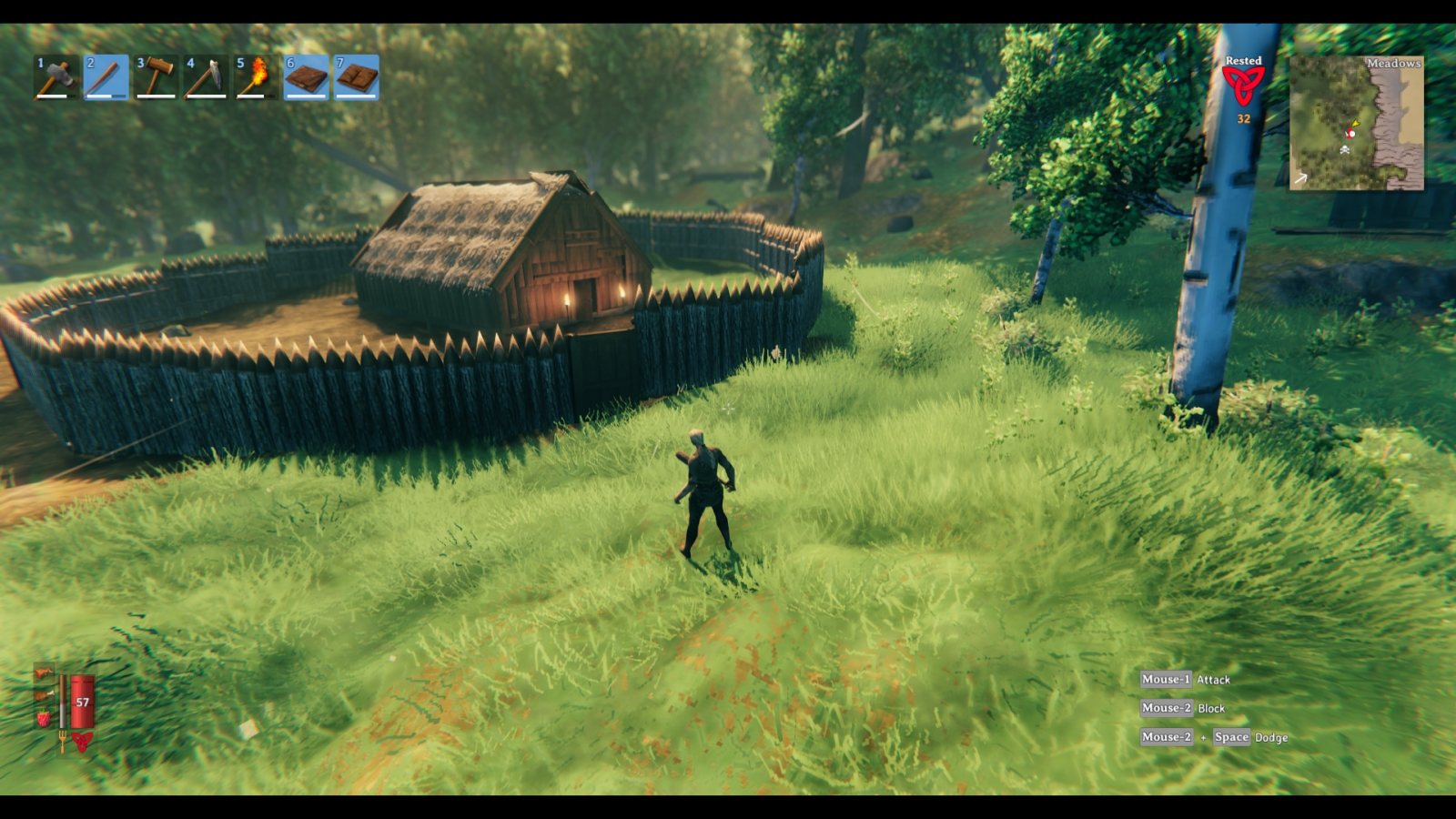 My first swing at building a house was pretty terrible, the thing barely held together, and I almost died from smoke inhalation from the campfire you need to place near your bed. You should place a bed as soon as possible, because this will be your respawn point in case you die…and trust me you will die. A lot. After realizing I needed some sort of ventilation in my house for the campfire, I broke the first one down and rebuilt a slightly bigger, and somewhat less janky house. Once I was able to craft a hoe, I expanded on the homestead by leveling out the ground to start making a bigger home. I put my son to work chopping down trees and making chests for storage, and on one adventure a tree he had chopped down knocked down several other trees in the area and killed me. Life ain’t easy in Valehim, but it sure can be rewarding. All that wood let us build a perimeter fence around our humble abode, to keep out boars, greylings, and worse.