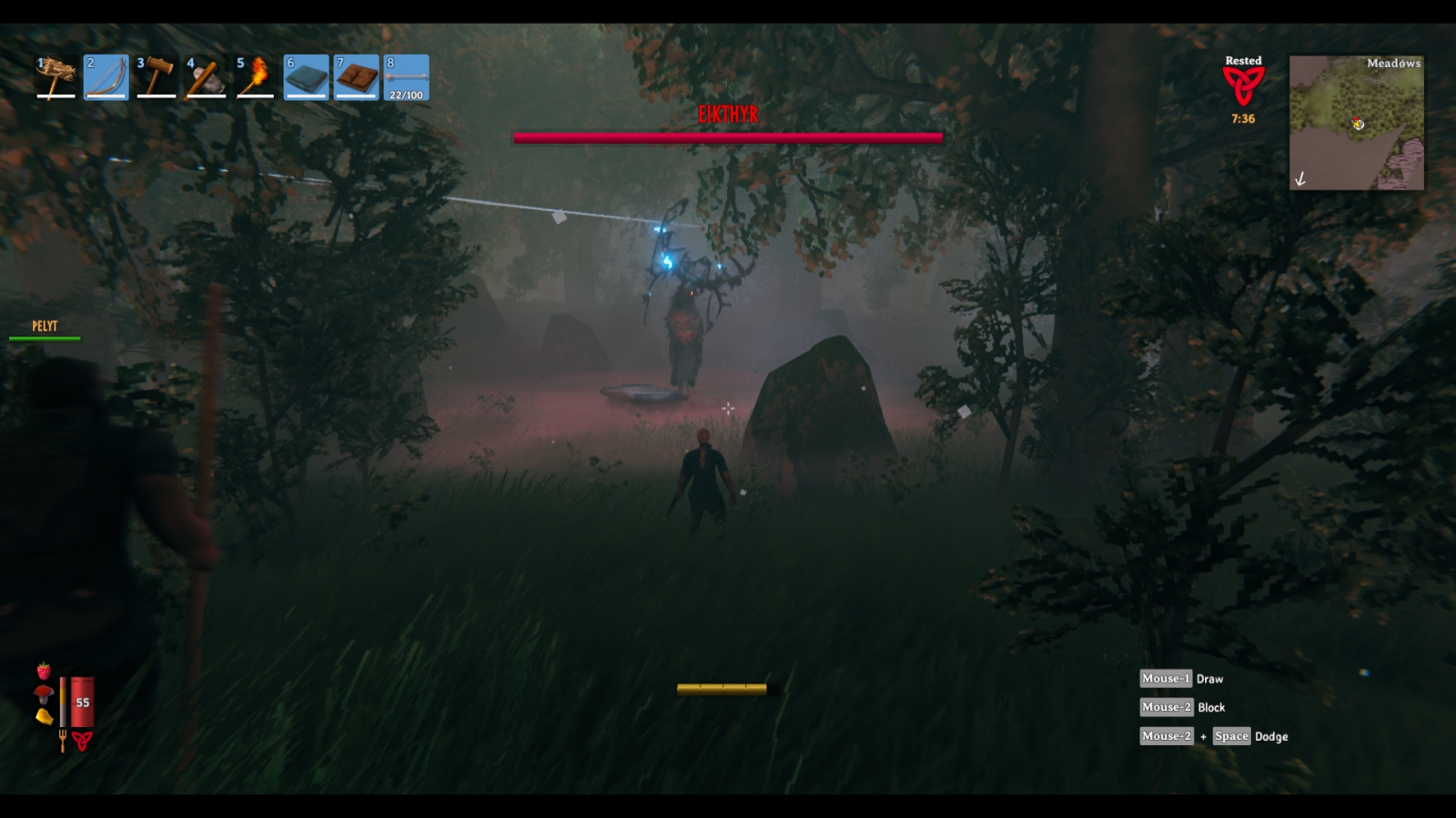 Finally we were ready (for real this time) to summon Eikthyr. The fight was a blast, and Eikthyr looks super cool. He is a huge buck with giant antlers, and his attacks include a charge and some nasty AoE lightning. Some kiting and a lot of arrows did the trick, and we somehow managed to take him down on the first try. He dropped some antlers that I was able to make an awesome two-handed hammer called the Stagbreaker with. We also grabbed his head, which we took to the altar with the mysterious hooks. After hanging Eikthyr’s head on the hook, we got a buff we can activate every fifteen minutes which lets us run and jump super fast.