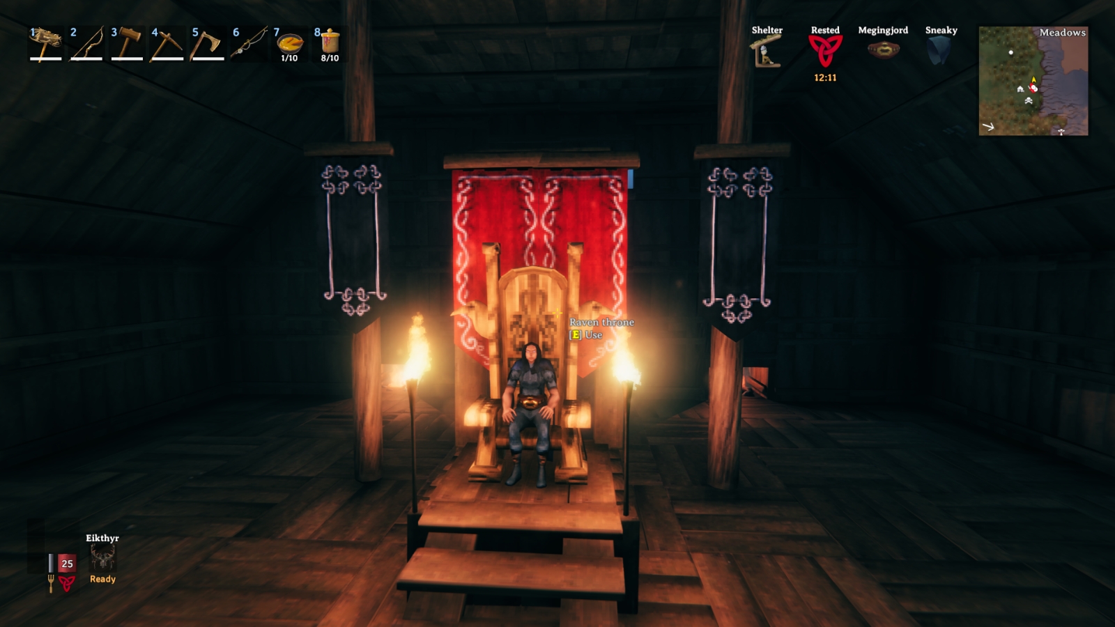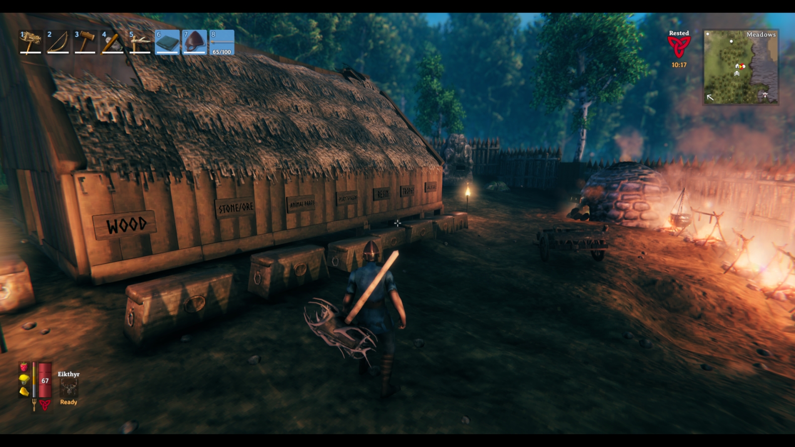 When you first arrive in Valheim, Hugin marks your map somewhere deep in the Black Forest and your goal is to get strong enough to face Eikthyr. He doesn’t give you much more than that, so you have no idea what you’ll be up against. Before adventuring out, our house was hit several times by coordinated attacks. “The forest is moving!” appeared on our screen and before long, several creatures were descending on our house. That is where the perimeter fence came in handy. They couldn’t break in to destroy our house, and we were able to go out and pick off what we could. In between attacks, we gathered up as many supplies we could, and cooked up a bunch of meat. Our house is situated in the Meadows, which is somewhat safer than The Black Forest, so we felt it was better to keep our house there until we explored more to decide if a move was needed.