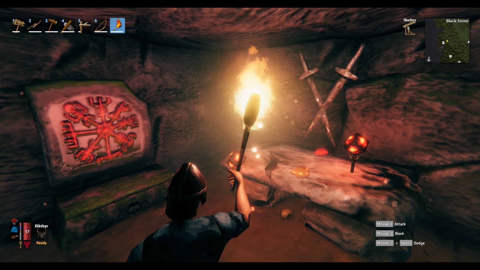 Our old friend Hugin the raven showed up to give us our next task, to find The Elder, who was even deeper into The Black Forest. But first things first, we upgraded our items, and now with the help of the antlers we were able to make pickaxes to dig and mine with. Getting some fresh supplies enabled us to upgrade our workbench even more. Once we mined some copper, Hugin told us that we could find Surtling Cores beneath the earth in The Black Forest. So, off we went back into the forest. After spending close to an hour digging all over the place, we didn’t find anything interesting, and my husband wanted to resort to a guide. I generally try to stay away from looking up guides in games like this, but whatever the Surtling Cores gave us was the key to moving on to the next step of the game, so after a quick peek, we were off to find Burial Chambers.