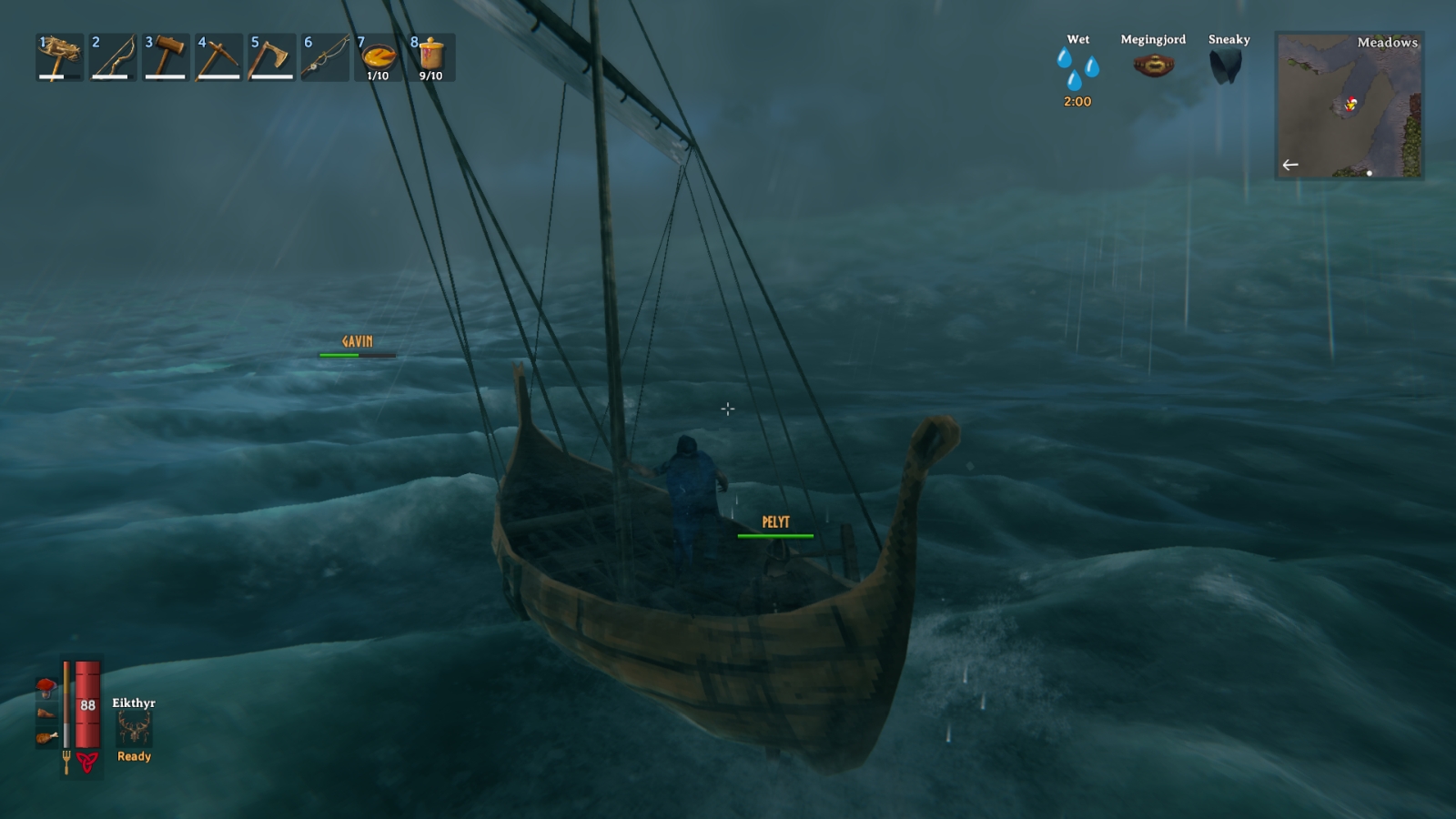 We’ve gotten much braver in The Black Forest now, and taking down trolls is a breeze. Now we are in the process of moving all of our stuff from our little house into a bigger crafting hall we have created. I managed to capture some boars, which breed adorable little piggies, so we have an endless supply of boar meat. We’ve found the merchant and now I can fish, and we have some portals that allow us to move between locations quickly. Our last adventure as of writing this took us into The Plains, which we are definitely not ready for. While we were sailing back from discovering the new lands, a horrible thunderstorm came which washed waves over our boat. My poor son got tossed overboard, and it was quite the adventure trying to loot his body in the middle of the ocean in a big storm. Life is brutal in Valheim, but at least we have each other.