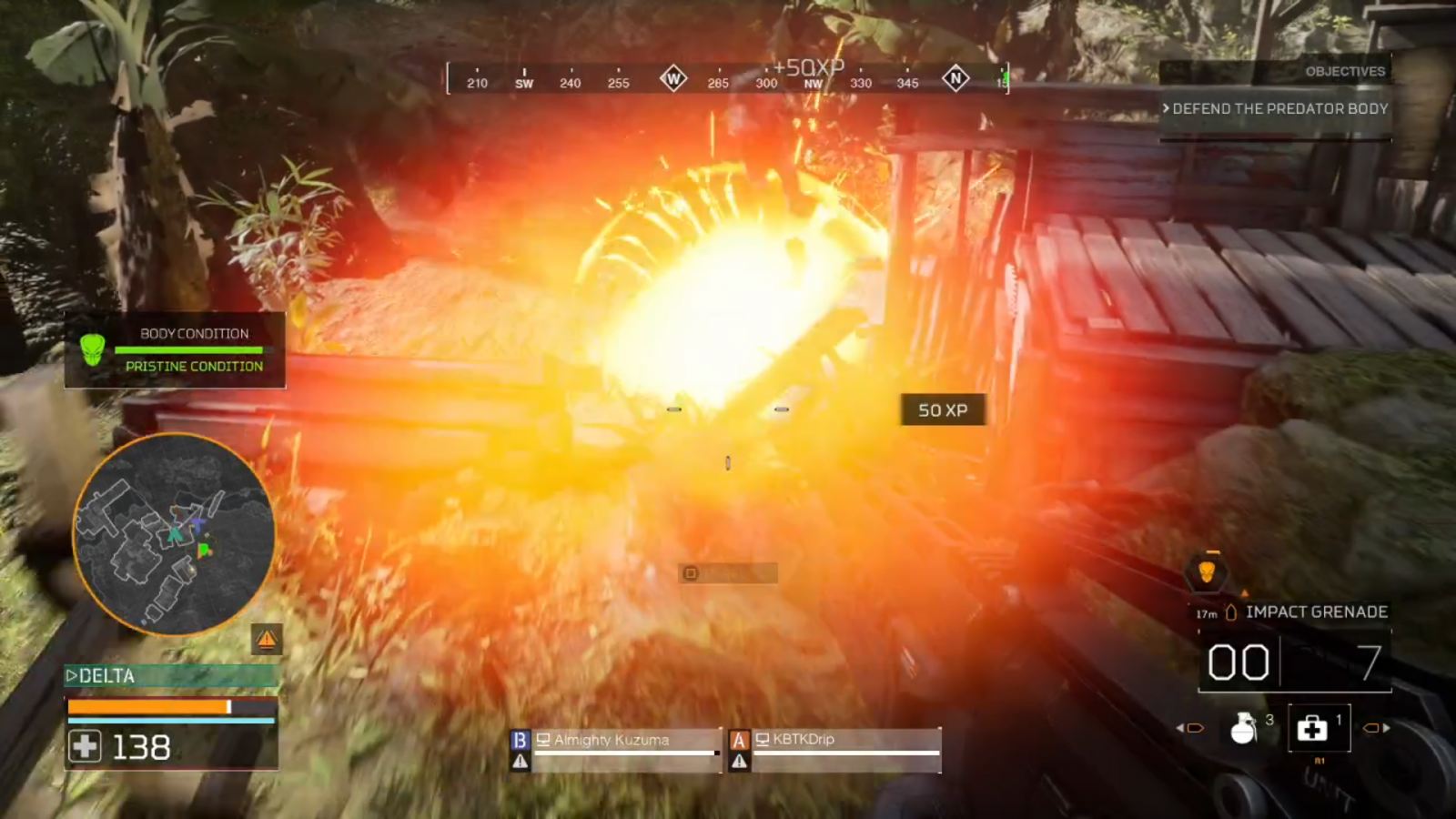 At the start of a match, the launcher comes loaded with ten grenades, but you can restock with ammo bags or ammo crates. You can only hip fire with it, but that won’t hinder you in any way, especially with Dutch’s increased hip fire accuracy. The best part is that instead of landing and exploding a few seconds later like regular grenades, they explode on contact, damaging anything in their radius. I’ve sent a few Predators running, and plenty of soldiers flying with these grenades. My one issue is that I can see the potential of these becoming too powerful. For example, if a four man squad all let loose on a Predator with this grenade launcher, I’m not sure how long the Predator would survive. I’m not saying they would be wiped out instantly, but they’d take a beating for sure if they couldn’t dodge fast enough. I’m definitely glad that the Hammerhead exists, but I won’t shy away from its potential to become a Predator’s overwhelming nightmare.