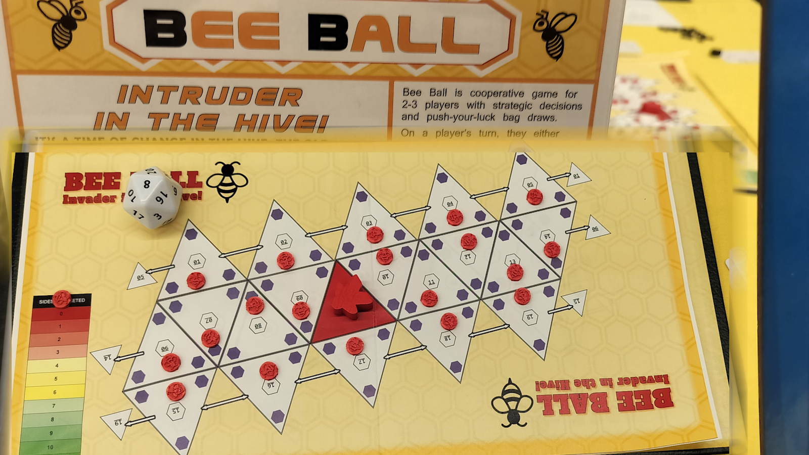 That’s the concept of Ed Wedig’s Bee Ball, a cooperative game about a bee hive defending itself against a wasp scout. The board is basically a dodecahedron (a d20 to fellow tabletop nerds) layed flat. This represents the ball the bees are beginning to form around the wasp, while the wasp moves around looking for a way to get out, taking out bees as it goes.