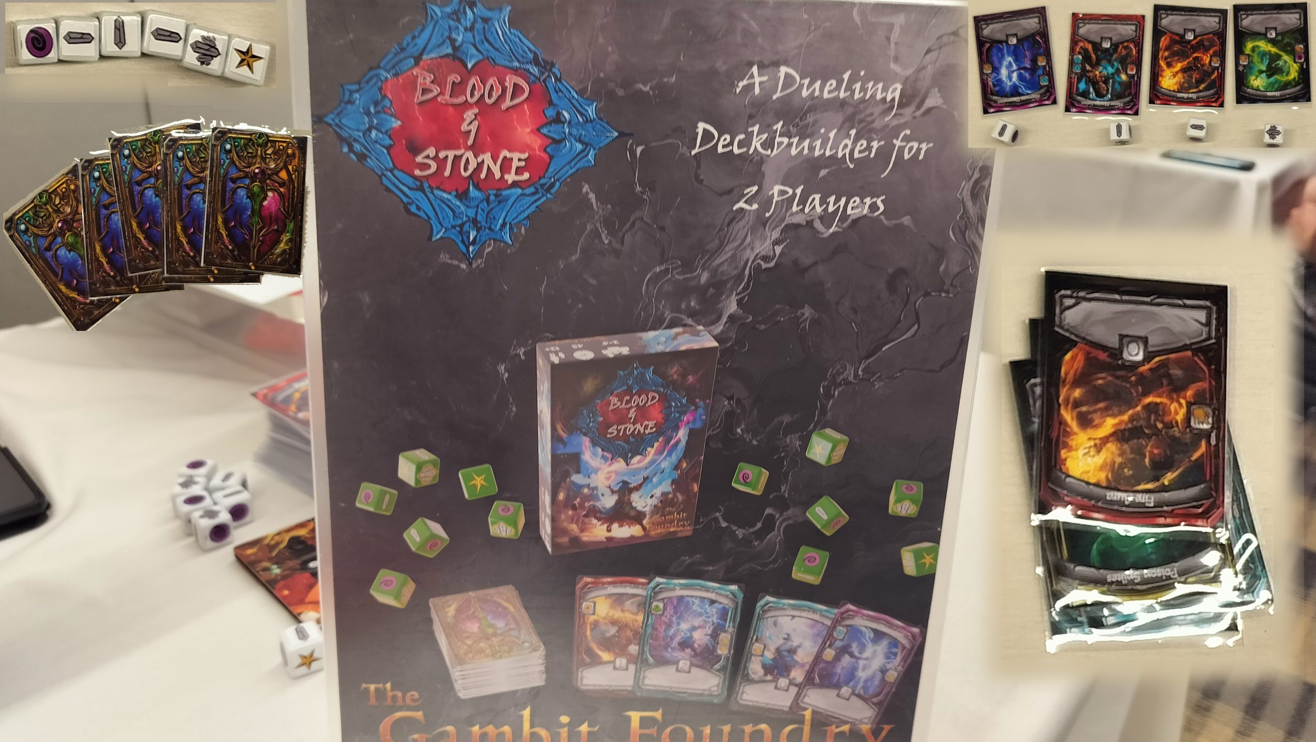 Blood and Stone is a magical deck builder. Each turn, players roll a bunch of dice that can be used as resources. Some resources provide power to play cards, others additional mana to buy more cards from a fast moving market. Each player is only allowed to play one card a turn unless they can combo it by playing another card (and paying for it) that shares a color with the card played before it. This enforces certain archetypes onto players, leading them to play into certain colors. The starting cards are basic, but each is a different color, along with black, which makes them kinda like glue for the rest of your deck. Once you have a deck you like, you can use your mana to cast directly from the market instead of spending it on fattening your deck.