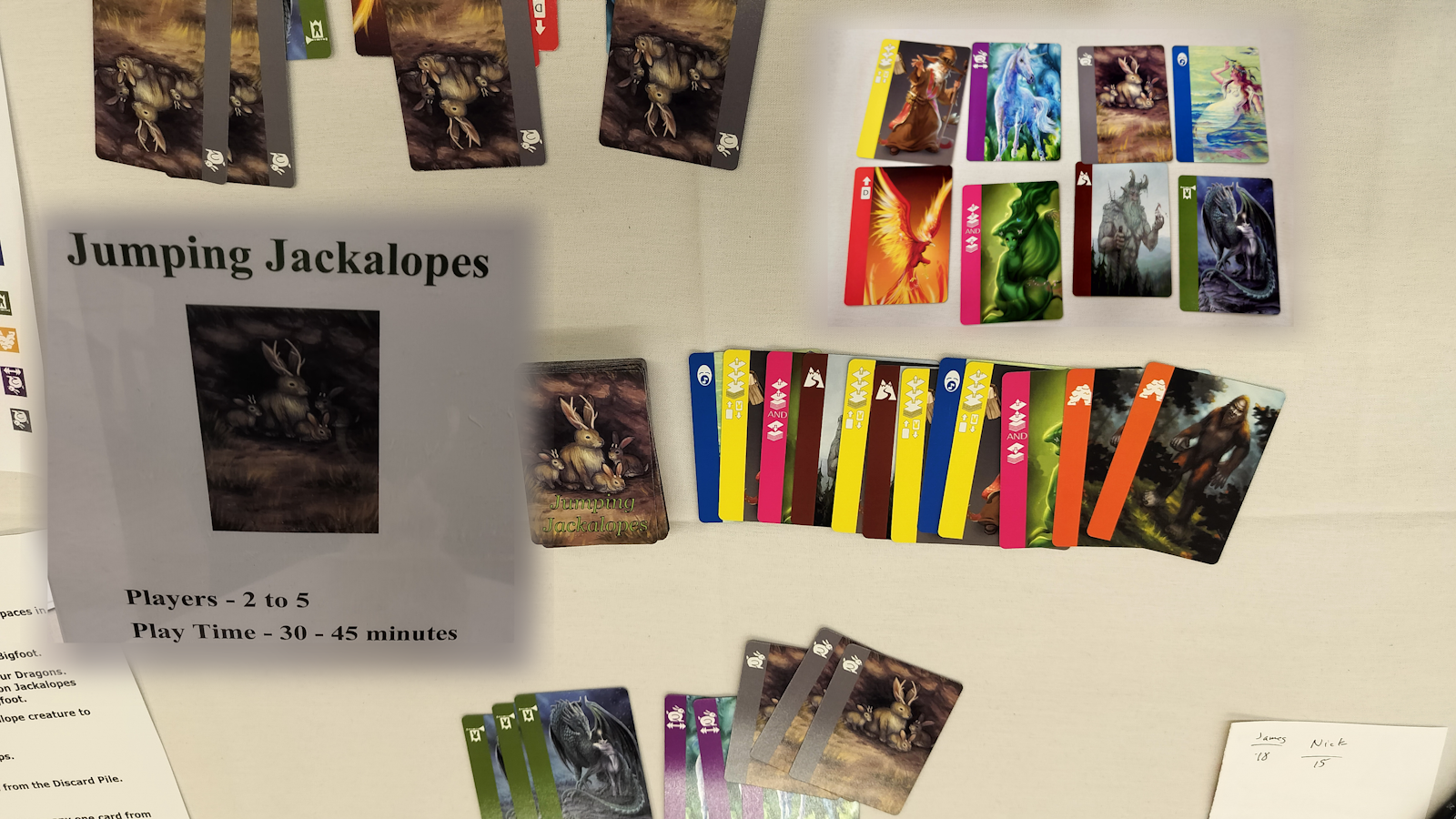 Jumping Jackalopes is a Rummy style tableau builder, where players build a map around the table, which becomes an environment for the other cards they play to interact with. Players take turns drawing and playing their fantasy cryptids in sets, with each card possessing some sort of power, such as stealing cards from other players, creating obstacles on the map, or moving the titular Jackalopes. See, the major share of the points come from Jackalopes, which move around the map created by the cards each player plays in front of them. Each one provides more points than any other creature combined, but it’s often hard to predict where they’ll wind up. In a 2 player game, it felt like each card played was a tactical choice, but I think in higher player counts, the chaos will be just right for a great party game.