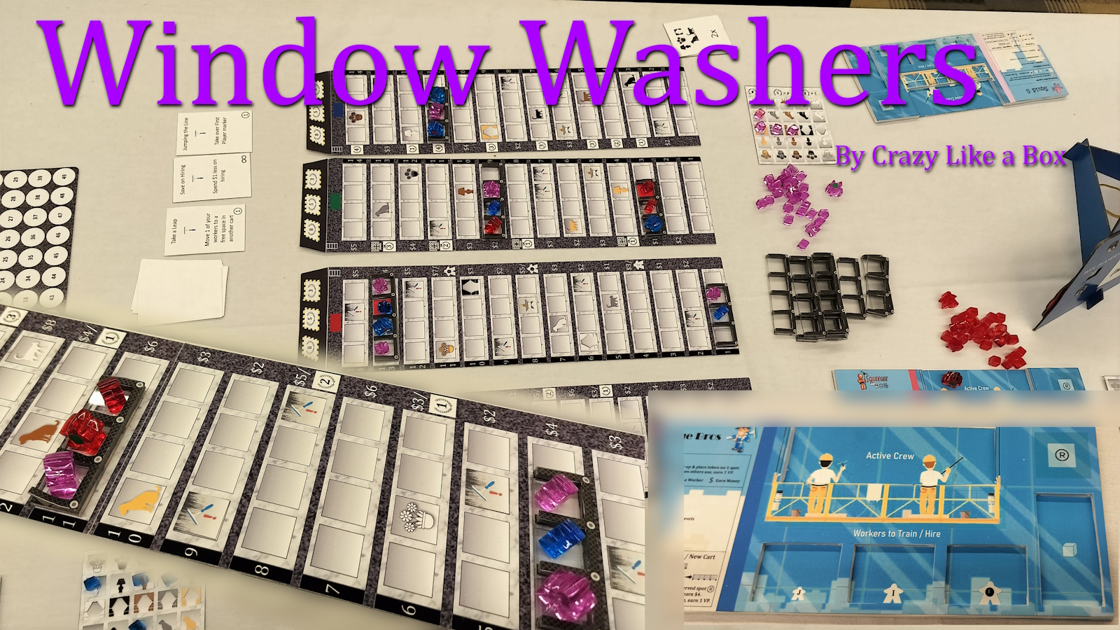 Window Washers provides an interesting puzzle. It mixes worker placement with some minor programming and prediction to create little point engines each round. Players will take turns choosing places on window-washer platforms, and each worker placed will move the platform up depending on the strength of the worker. On the buildings are symbols providing scoring and resources, which can be used to further upgrade the workers, their equipment, and the scaffoldings themselves. Finally, points are also attributed to the workers making their way to the top of each building first. Because of the intricate dance of platforms on skyscrapers, timing is everything.
