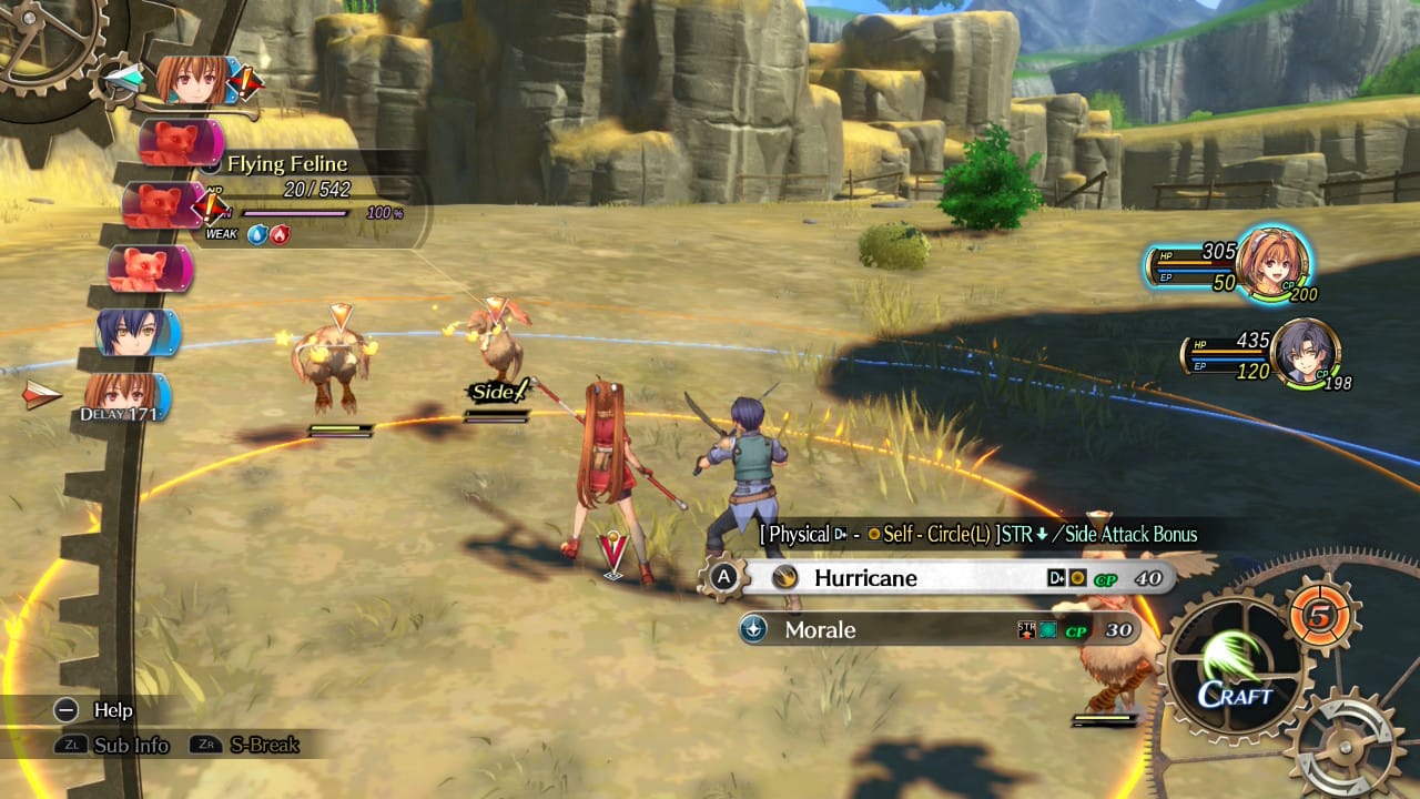 On their turn, you can move the current character around the battlefield within a circle determined by their Mov stat. You can perform a normal attack, use an item, defend, or prepare an Art or Craft. Arts are essentially spells, and the ones you can cast are determined by that character’s Orbment setup, which we won’t get into here. Unless you’re utilizing a 0 Arts turn bonus, casting an art will take up the current turn to charge, a later turn to cast, and then move your next turn after that further back. It may sound like a lot, and in other Trails games it may not be worth it, but here Arts are so powerful that you’ll want to make use of them frequently.