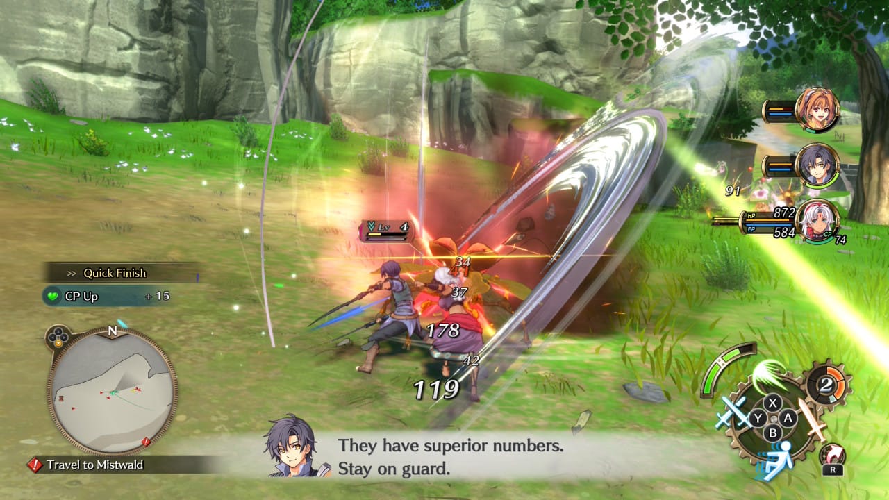 Initiating turn-based combat while an enemy is stunned will begin the battle with advantage. Any stunned enemies will be unable to act for their first turn, and you’ll be able to execute a Brave Attack, similar to those from the Cold Steel games. From here, you actually have two options: either having a party member perform a follow up attack on a single foe, or spending 3 Brave Gauge points to have two characters team up for a coordinated attack in an area around the stunned enemy. Properly strategizing with stuns and Brave Attacks can let you take out entire groups of enemies before anyone takes a single turn. It’s incredibly satisfying.