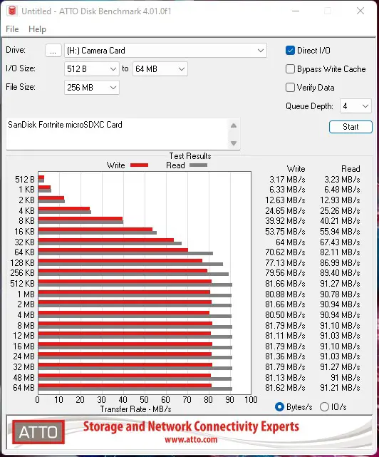 For reference, SanDisk’s own Ultra PLUS 256GB microSDXC UHS-I Memory Card advertises a maximum read speed of around 130MB/s. In our own testing, we find them hitting around the 90 MB/s range on average, with cheaper cards being closer to the 80s. Here we see these cards delivering in that high-end range at 95MB/s read, and 83MB/s write. The write speed is another aspect that can vary wildly, so it’s good to see consistency here. Speaking of consistency, let’s look at my other favorite benchmark utility – ATTO.