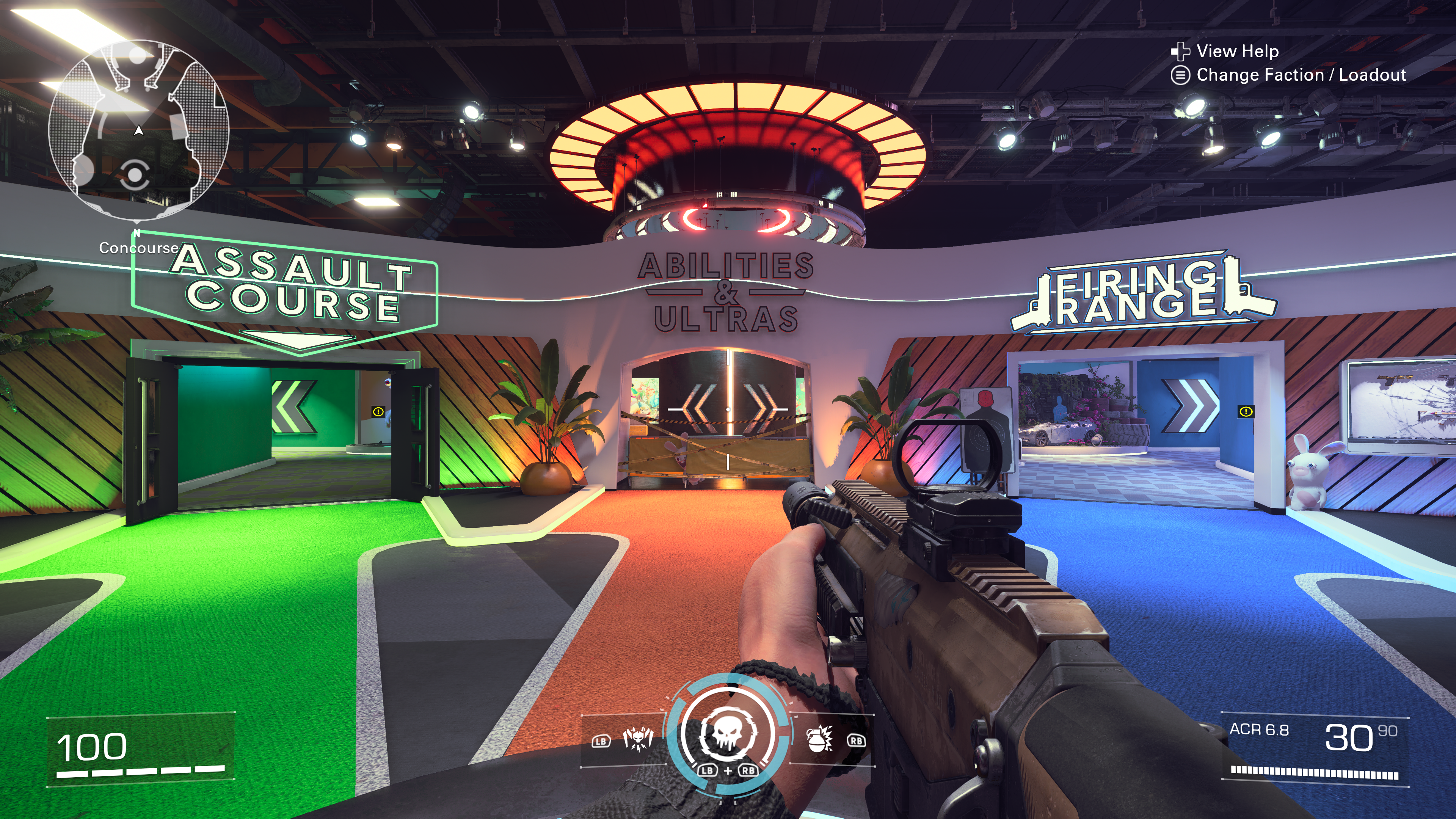 If you’re wanting to learn about or experiment with different loadouts or factions, you can head to the Practice Zone. It’s a work in progress still, but you can visit the Firing Range inside to test out different guns and then head over to the Assault Course to test your skills in a time trial. There’s also an Abilities & Ultras section, however that section is still under construction, or the Rabbids broke it. Yes, Rabbids! The Practice Zone is the big Easter Egg dump of XDefiant. There’s a Rabbid stuck in the barrier that blocks off the Ultras & Abilities section. You’ll find references to a lot of Ubisoft’s IPs like Assassin’s Creed, Immortals Fenyx Rising, Rabbids, Far Cry, The Crew, Just Dance (DDR style), Rider’s Republic and others. However, even though the Rabbids broke the Ultras & Abilities area, you can still unleash them in the concourse.