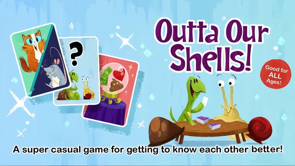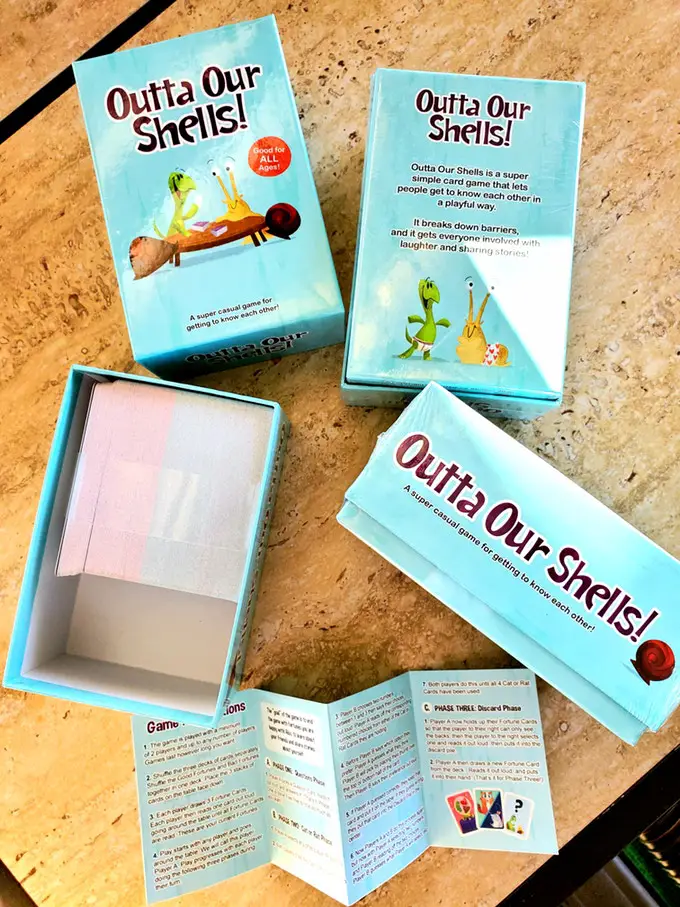 When we converse casually, we don’t have any agenda, and conversation wanders at random. It tends to go down the path of least resistance. Work, school, what our plans are for the weekend, our health, problems, etc. We usually don’t have “fun” conversation. We are also not all the same when it comes to social facility and to extroversion and introversion. This means that in groups, invariably some do all the talking while others sit in the background. I was noticing this over and over again in social situations and feeling like I wanted more enjoyable connection and more inclusive connection, so Outta Our Shells was born. To be quite honest, I really just made it for myself and my friends and family originally. And I have been using it for the last 10 years or so. It seems to be super effective at getting people to relax and laugh and get to know each other, and at bringing everyone into the conversation.