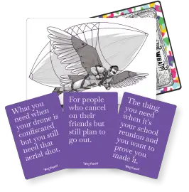 We want the pitch prompt cards to get people started so that the pressure is off to think on your feet but honestly after all the playtesting it has been astounding to see how everyone who plays no matter their background opens up and becomes creative geniuses naturally.