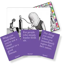First of all, both those games are amazing! Yet if you’re not creative it can be a heavy lift. We spent hours writing and re-writing the purple Pitch Prompt cards to work seamlessly to work as a pitch on its own – or people can expand upon them. For instance, my mom is amazing at trivia games but is not so great at Snake Oil type of games where the fun comes directly out of the creativity of the players. Even a reviewer said “One of the things that really impressed me with What the What?! are the prompt cards. The way that these cards are worded makes them work seamlessly for every single invention in the deck.”