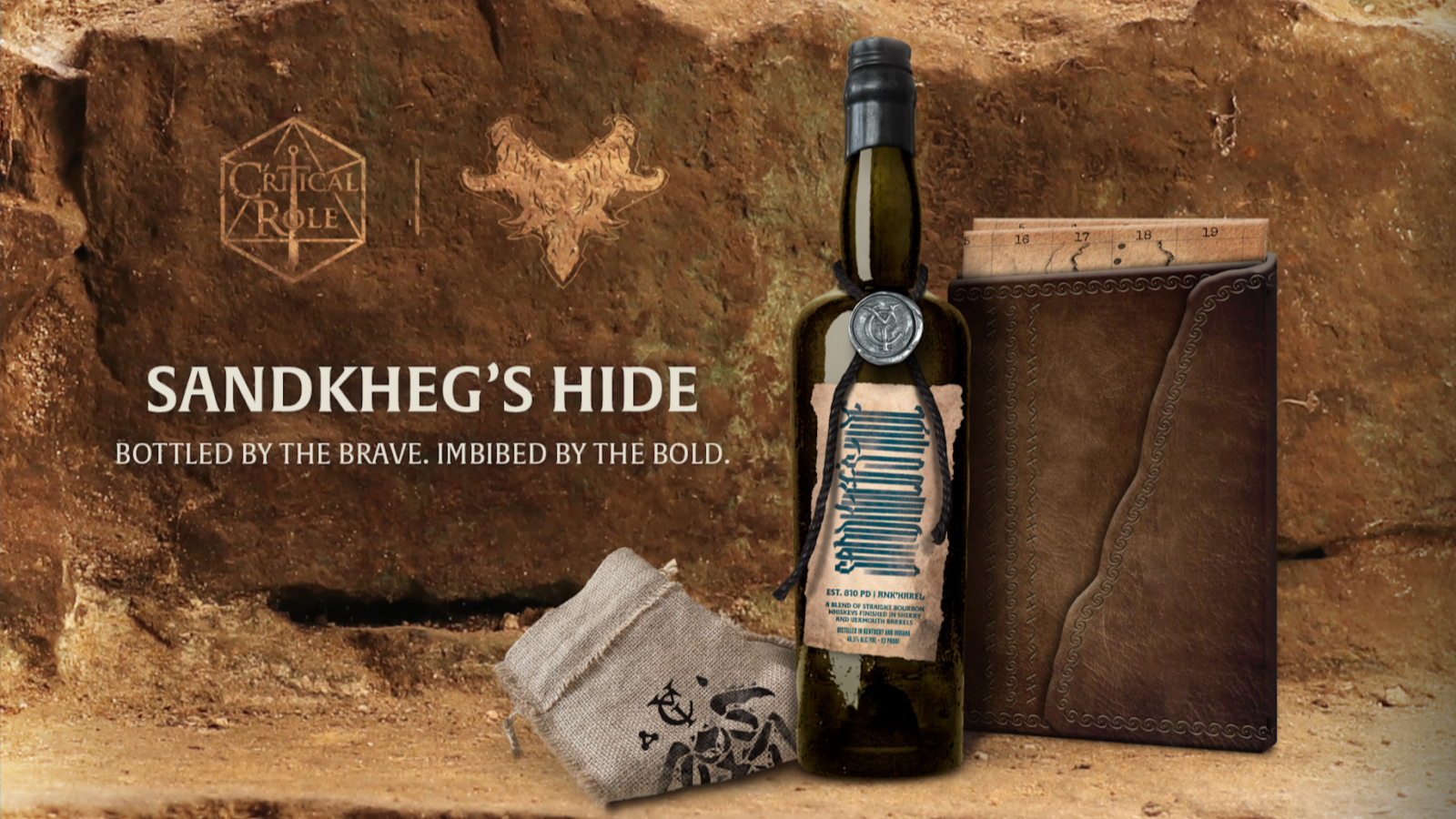 Straight out of the lore of Campaign 1 of Critical Role’s celebrated streaming series with Vox Machina, SANDKHEG’S HIDE is introduced as a “fierce” alcoholic beverage produced in the deserts of Marquet. Inspired by the description in the episode, the exciting new bourbon, from master blender Ale Ochoa, comes in dark green bottle with a distressed label, wax seal, and exclusive coin medallion around its neck, alongside a “found” journal from the Exandrian maker of Sandkheg’s Hide that tells the story of this unique concoction, written by Jasmine Bhullar with all-original art by illustrator Tyler Walpole and a map by fantasy cartographer Deven Rue.