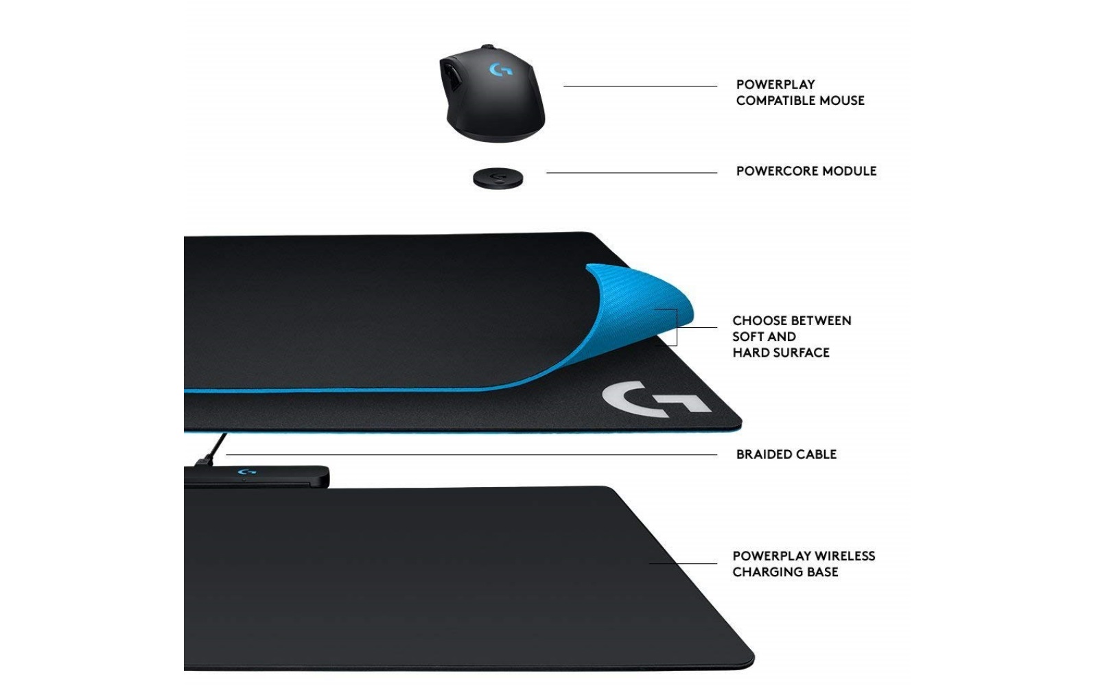 The PowerPlay Wireless Charging Mat comes with both a cloth and hard surface, and measures in at 321mm in length, 344mm in width, and 43mm depth. The cord that plugs into the base can also be plugged into the wireless mouse in the event you do get low on battery (which has yet to happen). It also has RGB Lighting with the Logitech G logo on the PowerPlay Base.