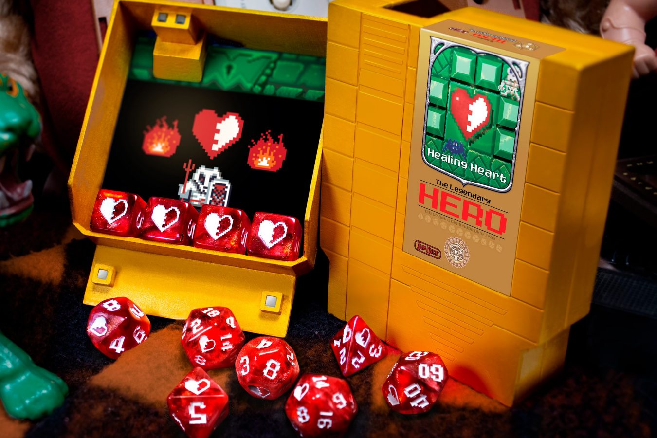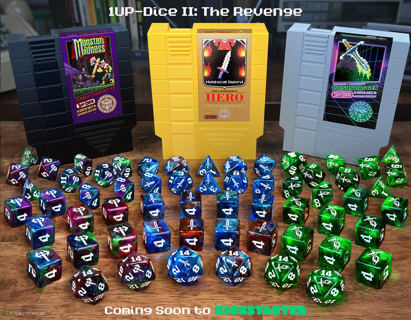 1-UP Dice, heavily inspired by nostaglia for the 8-bit video gaming era, will re-launch on Kickstarter on April 19th, 2022. The dice will be multi-colored and come in NES cartridge shaped boxes. You can read more below: