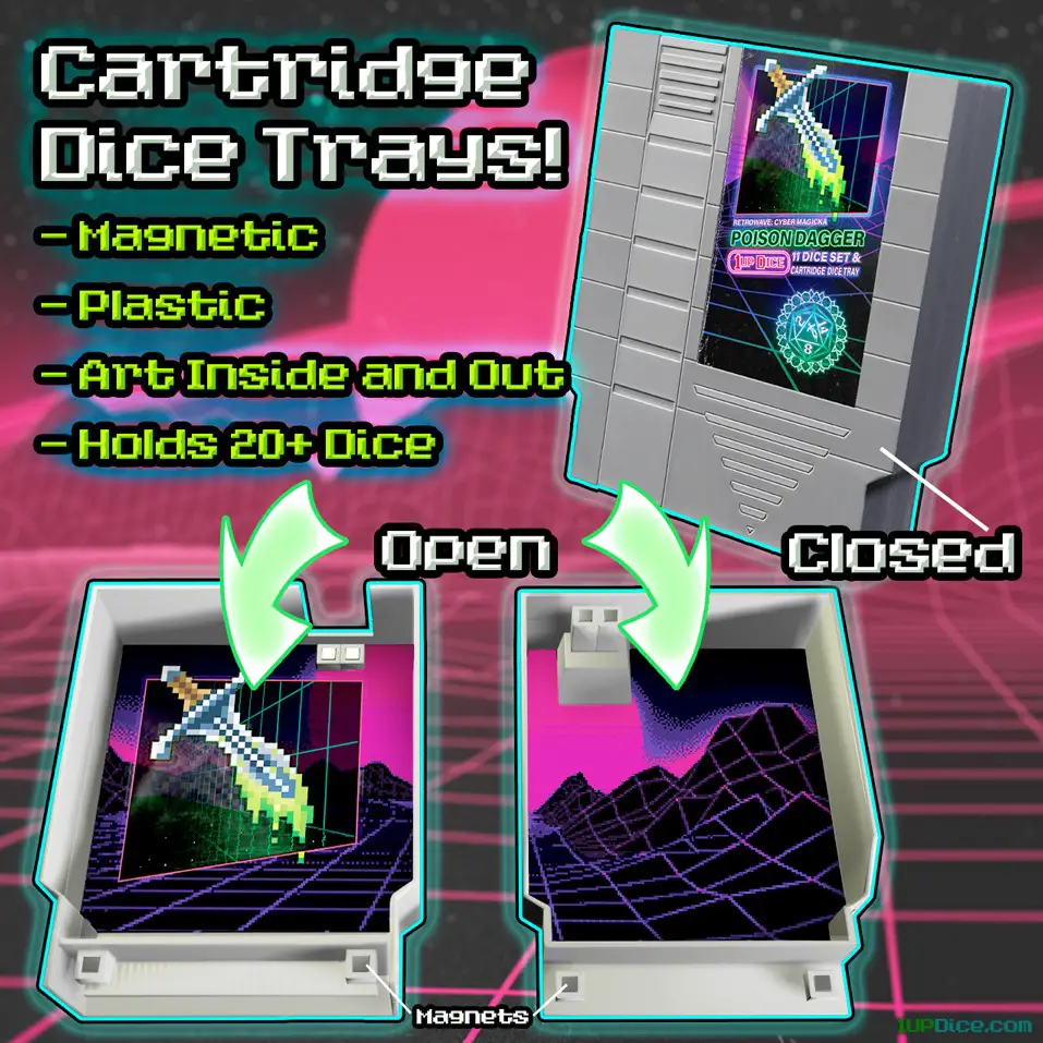 Cartridge dice trays (plastic, hold 20+ dice, magnetic closure, art inside and out).