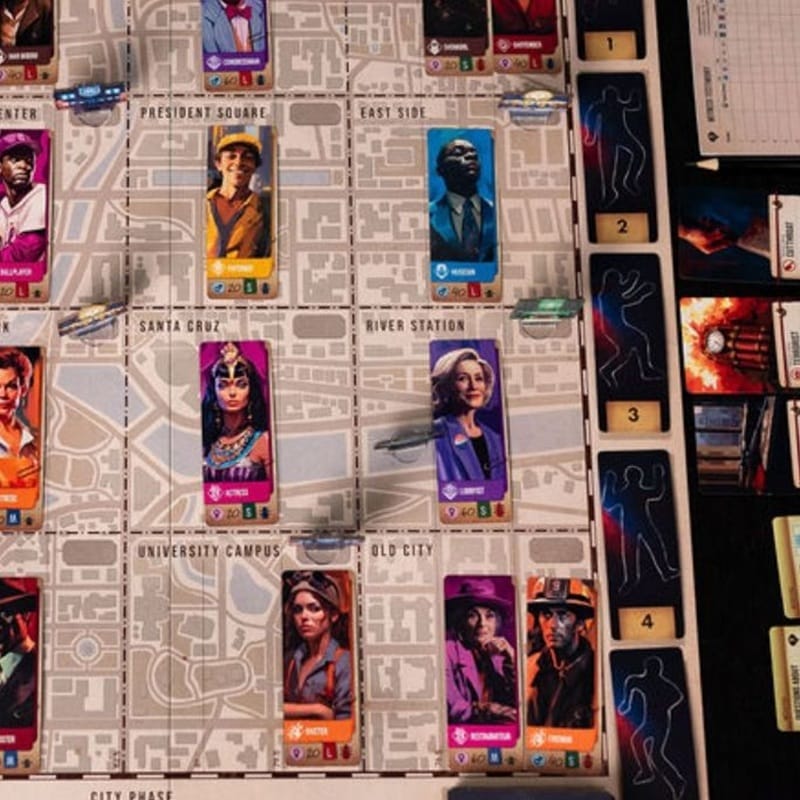 The Detective Phase consists of two steps: initial response and investigation. If a murder occurred the detective moves their marker to the new crime scene and moves civilians at the scene away. During the investigation the detective can take two actions choosing to question civilians, build buildings like hospitals, police stations, fire stations or diners as well as move through the city. They can also use their surveilance token to figure out the motive.