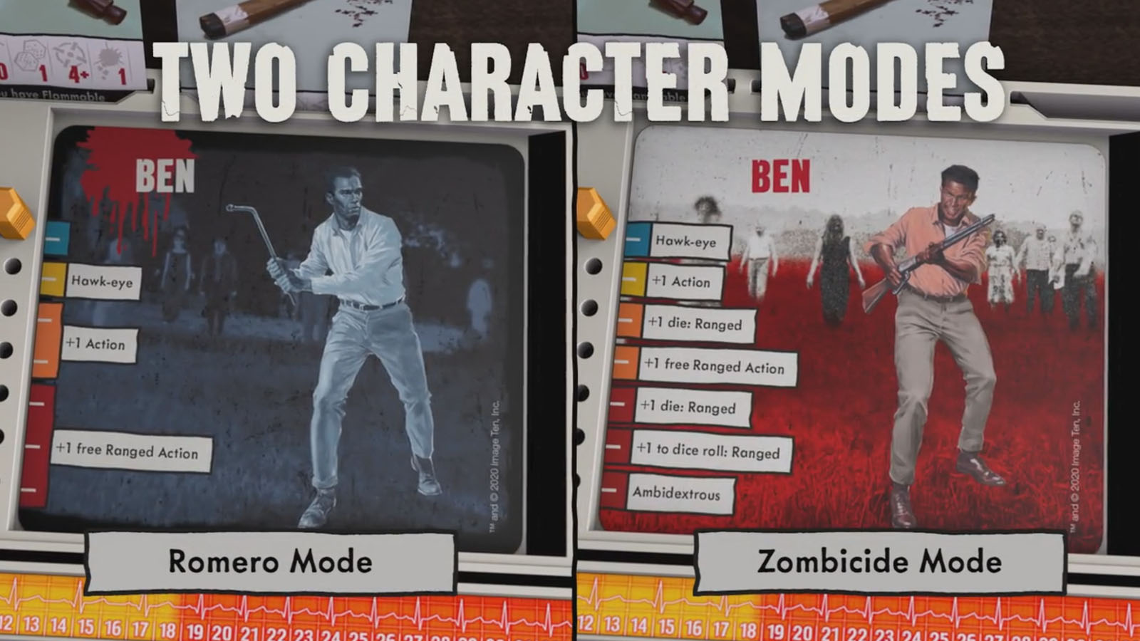 “Zombicide mode” represents the development of the characters. Team oriented, more powerful, and seeking some good old Ghoul-killing fun, these heroes are more apt at survival. They are, however, not unbreakable. Encountering once-loved Relatives who have turned into ghouls causes emotion distress to the whole team and immediately draws them back into Romero mode.