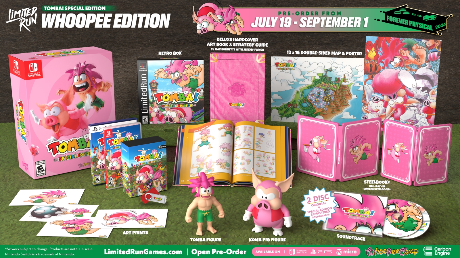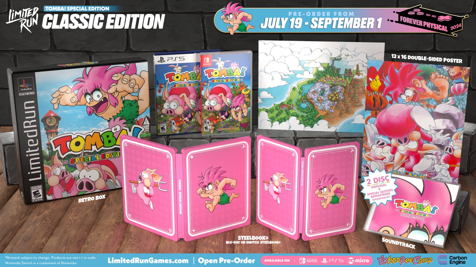Today, Limited Run Games revealed the physical editions for Tomba! Special Edition. These include a standard physical, with just the game (on a thumb drive for the PC version), a Classic Edition including the game, a booklet, a double sided poster, a SteelBook, a two disc soundtrack with the original and remastered tunes, and a collector’s box. Finally, the Whoopie Edition, named after developers Whoopie Camp, gets you everything in the Classic Edition plus Tomba and Koma Pig figures, art prints, and a hardcover art book and strategy guide.
