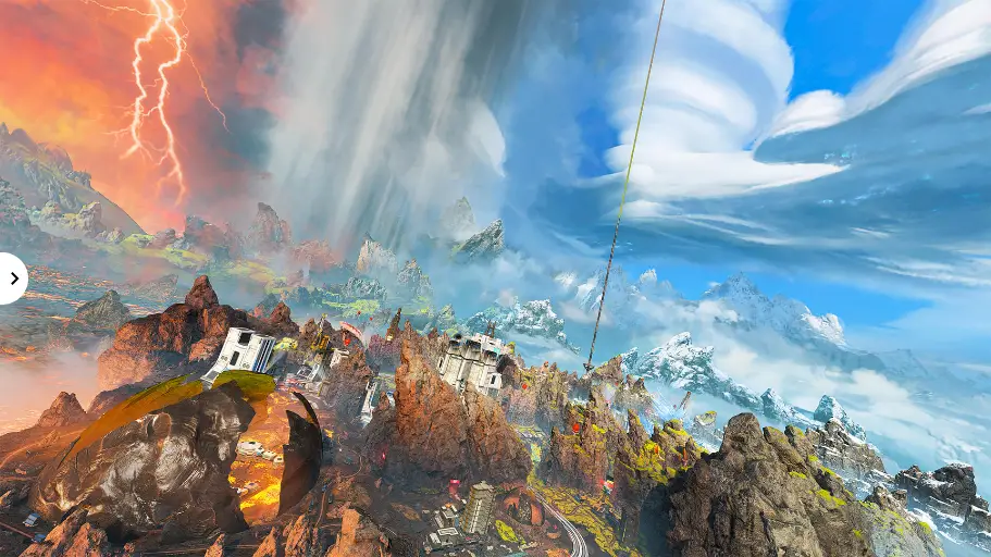 This version of World’s Edge looks to have more snow and lava, doubling down on the extreme climates the map is home to. Replacing the Refinery point of interest is the new Climatizer, a larger POI with more loot and interiors and exteriors that support close and long range battles respectively. Sorting Factory has sunken into a lava pit, to be replaced by Lava Siphon, which will be home to much more chaotic fights as well as a new rotation to the train tunnel behind. Train Yard is gone in the update, replaced by Landslide, a POI that does away with the many train cars that hung overhead and provided a huge advantage to teams holding them. There is almost as much loot in Landslide as there was in Train Yard, and the redesign is meant to provide more clarity in fights. Some spots that have not been touched for a while are getting new rotation points as well, including Overlook and Geyser. Lastly this map update brings Gondolas, which are essentially cable cars that traverse across large portions of the map (similar to the old train in World’s Edge), and skybox changes. Here, the lighting will be blue but some of the orange hue that has dominated World’s Edge since season 4 will still be present.