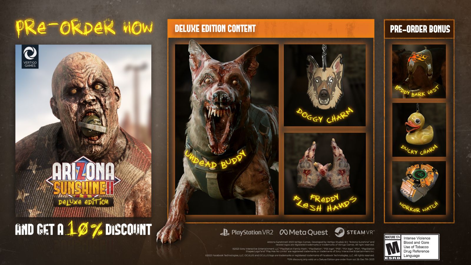 Pre-order Arizona Sunshine 2 now until the official launch on December 7th to receive time-limited in-game bonuses on Meta Quest, PlayStation VR2, and Steam VR. Furthermore, ordering the Deluxe Edition on PS VR2 and Steam VR will grant immediate access starting today.