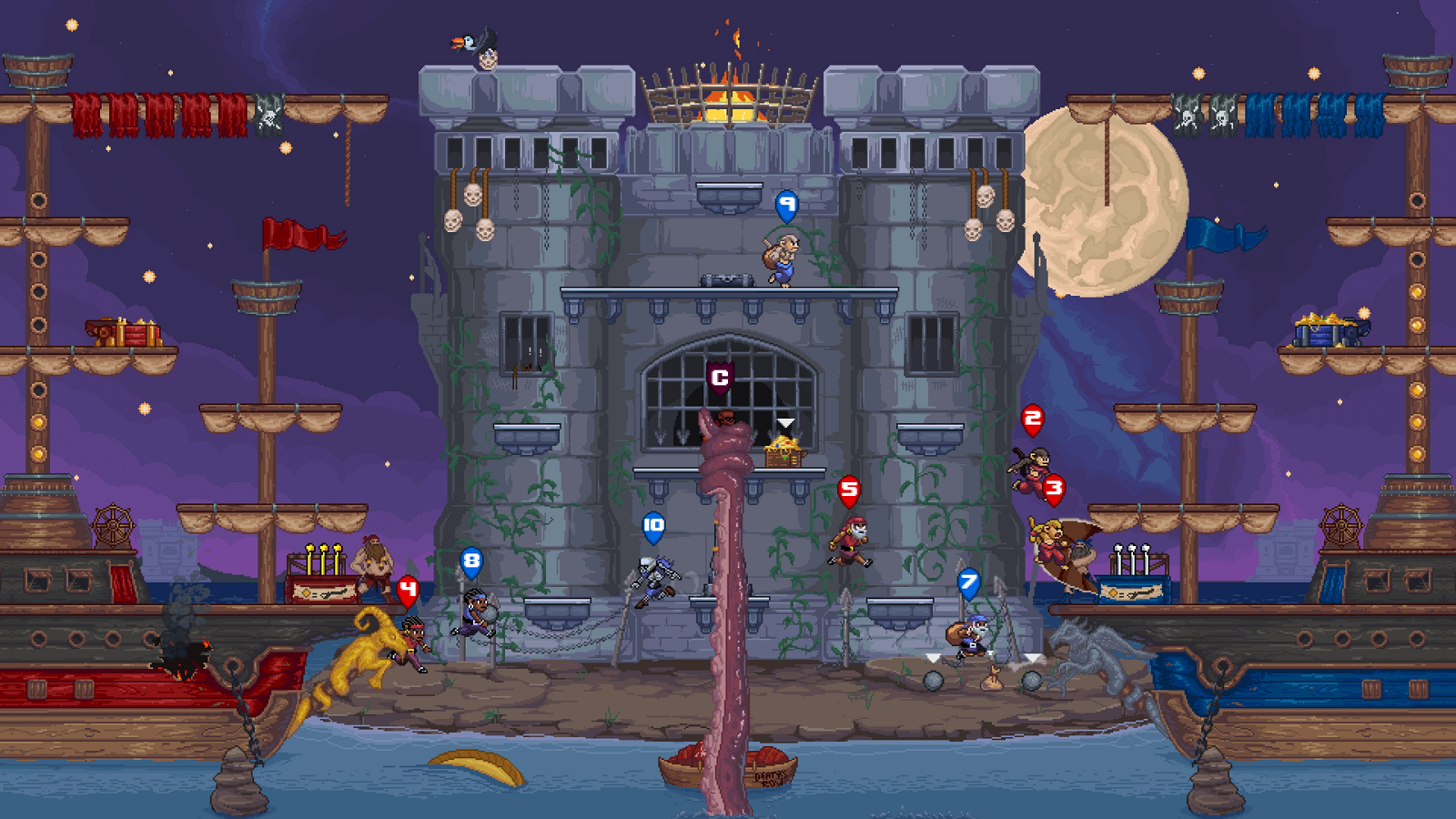 Inspired by classic SNES games, Plunder Panic blends retro graphics, arcadey action, and a boatload of online (and offline) gameplay modes and options to shiver even the most hardened pirates’ timbers. Two teams of up to six players must go all hands on deck and face off against each other, utilizing a variety of weapons, enchanted items, and power-ups. Quick, round-based matches begin as rival teams anchor their ships on the same island. Only the scurviest dogs will prevail once the action starts, with victory within reach if the rival team loses either too much of their gold, their ship gets scuttled, or if their precious captain takes a trip to Davy Jones’ locker. It’s up to teams to decide on an offensive or defensive approach!