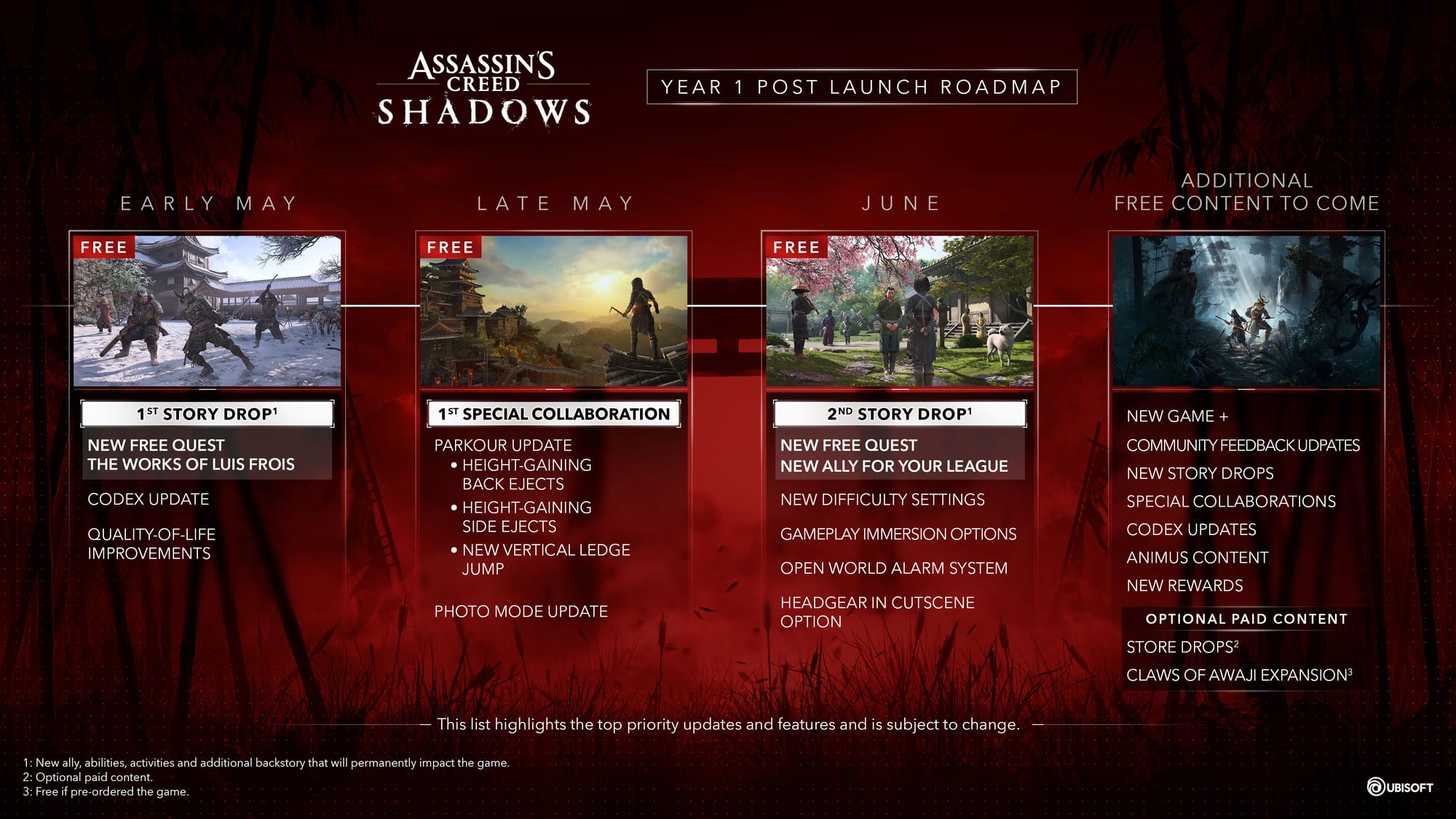 SAN FRANCISCO — April 30, 2025 — Today, Ubisoft revealed its Year 1 Post Launch Roadmap for Assassin’s Creed® Shadows, highlighting a series of regular updates that will expand the live game experience over time. These updates will contain free content for all players, including additional story content, special collaborations, updates made in response to community feedback, new rewards, and more.