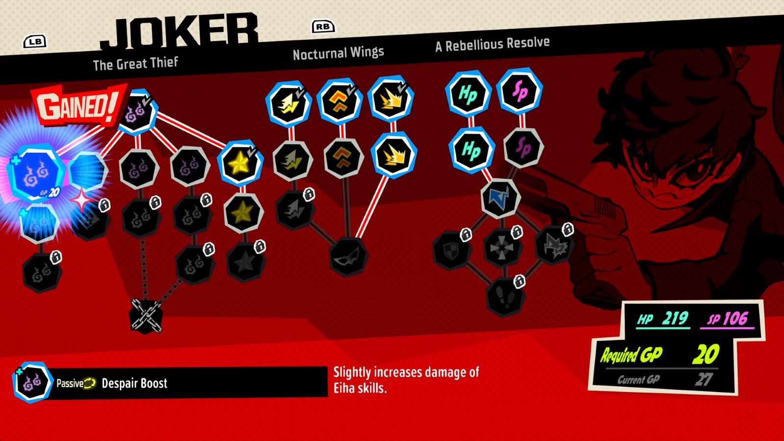 By winning battles to increase the levels of the Phantom Thieves or by listening in on the group’s interesting conversations in Talk events, you can earn GP (Growth Points) that will unlock skills in the skill tree!