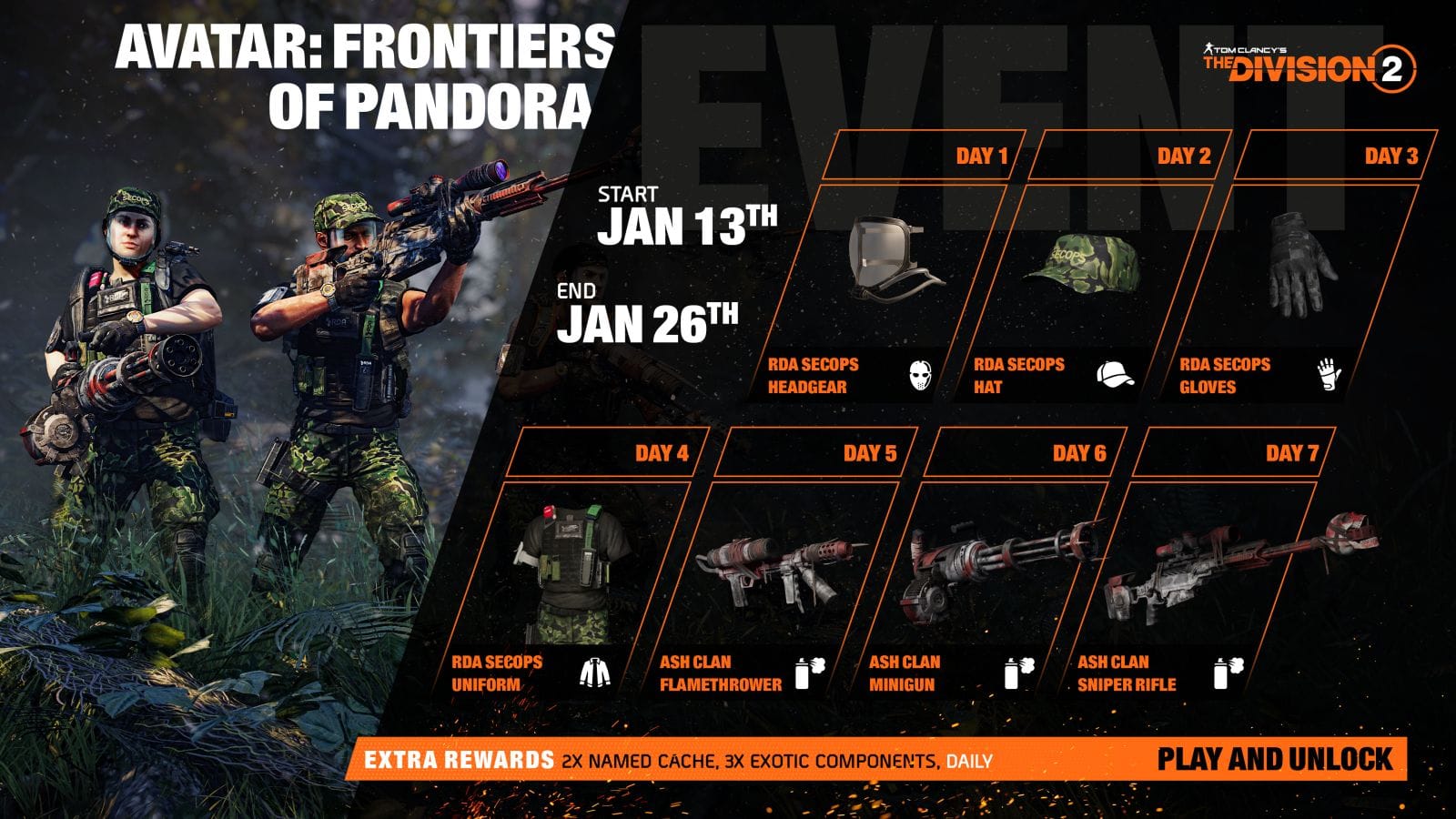 Two “Massive” worlds come together in a special crossover event bringing Avatar: Frontiers of Pandora into the Division 2. The entire set of collaboration rewards is free and can be earned through the themed Project Chain running from January 13 to January 27.