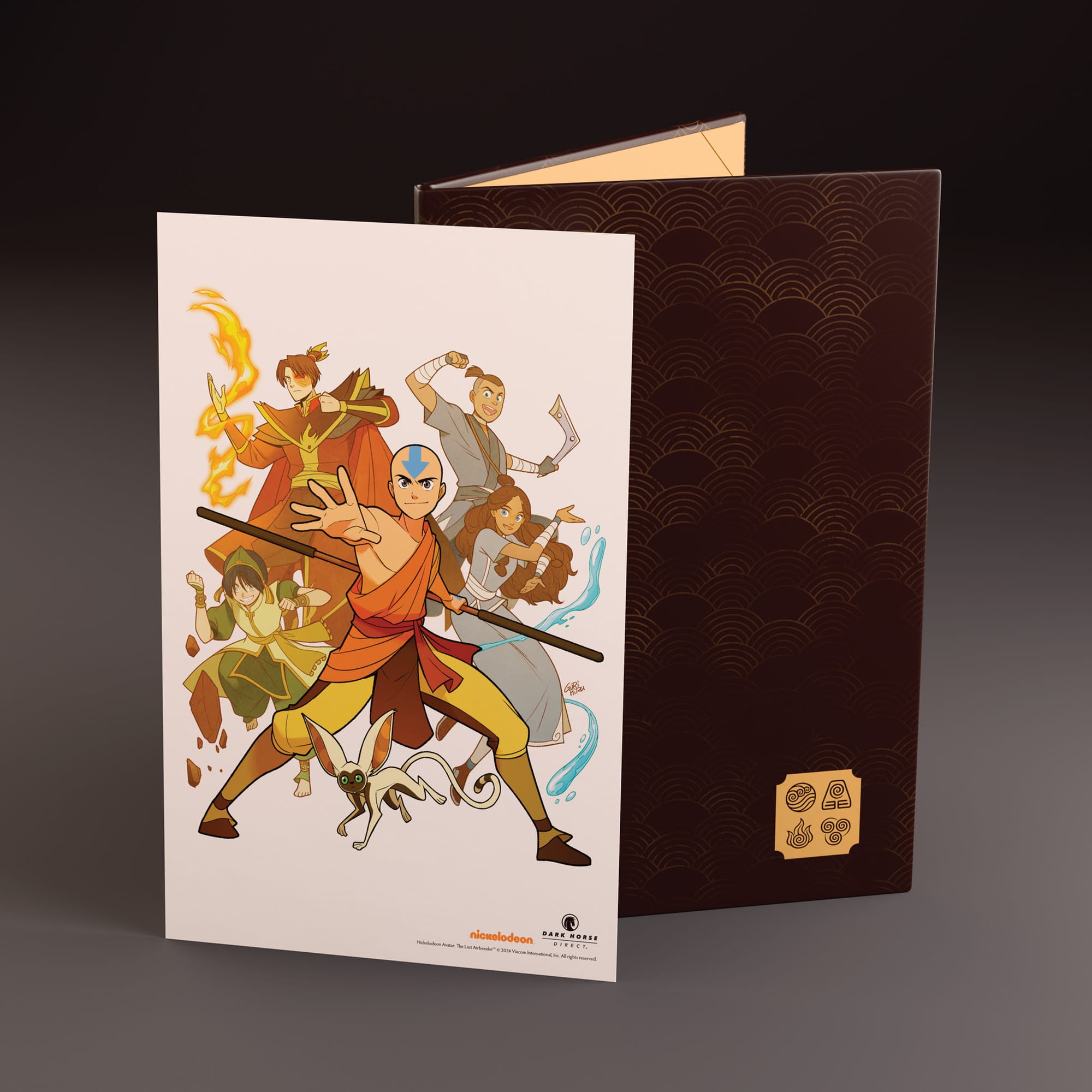 Dark Horse Direct, in collaboration with Avatar Studios co-creators Bryan Konietzko and Michael Dante DiMartino, presents a new Avatar: The Last Airbender Omnibus Ultimate Edition Boxed Set. This deluxe edition boxed set gathers the official graphic novel continuation of the hit animated series, featuring the complete stories of The Promise, The Search, The Rift, Smoke and Shadow, and North and South. The boxed set features a beautifully designed slipcase with gold foil highlights and includes an exclusive portfolio containing a lithograph of Team Avatar for display. Each of the five hardcover volumes in the set has an exposed spine. The comics are written by Gene Luen Yang (Shang Chi), with art and colors by Gurihiru (Gwenpool), and lettered by Michael Heisler (Star Wars: Knights of The Old Republic).